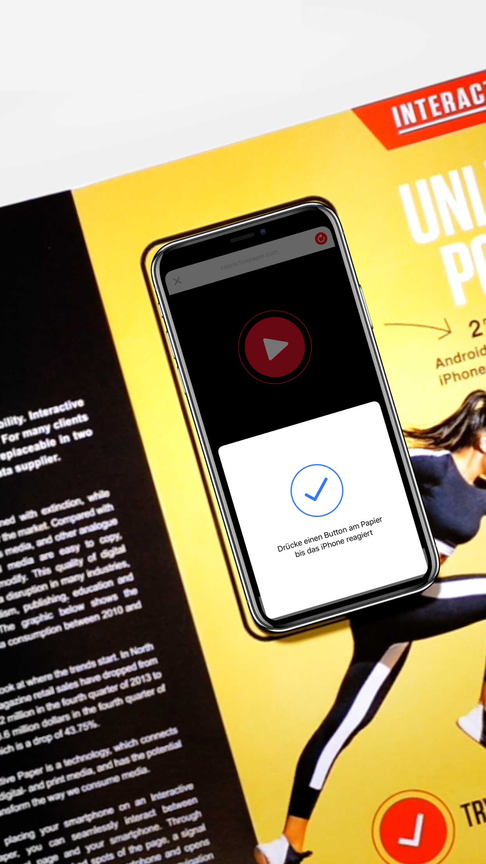 Place your iPhone on the paper and launch the Interactive Paper app. Press the interact button to start the NFC scan on your phone. Then press a button on the paper with your finger to experience interactive extra content on your iPhone.