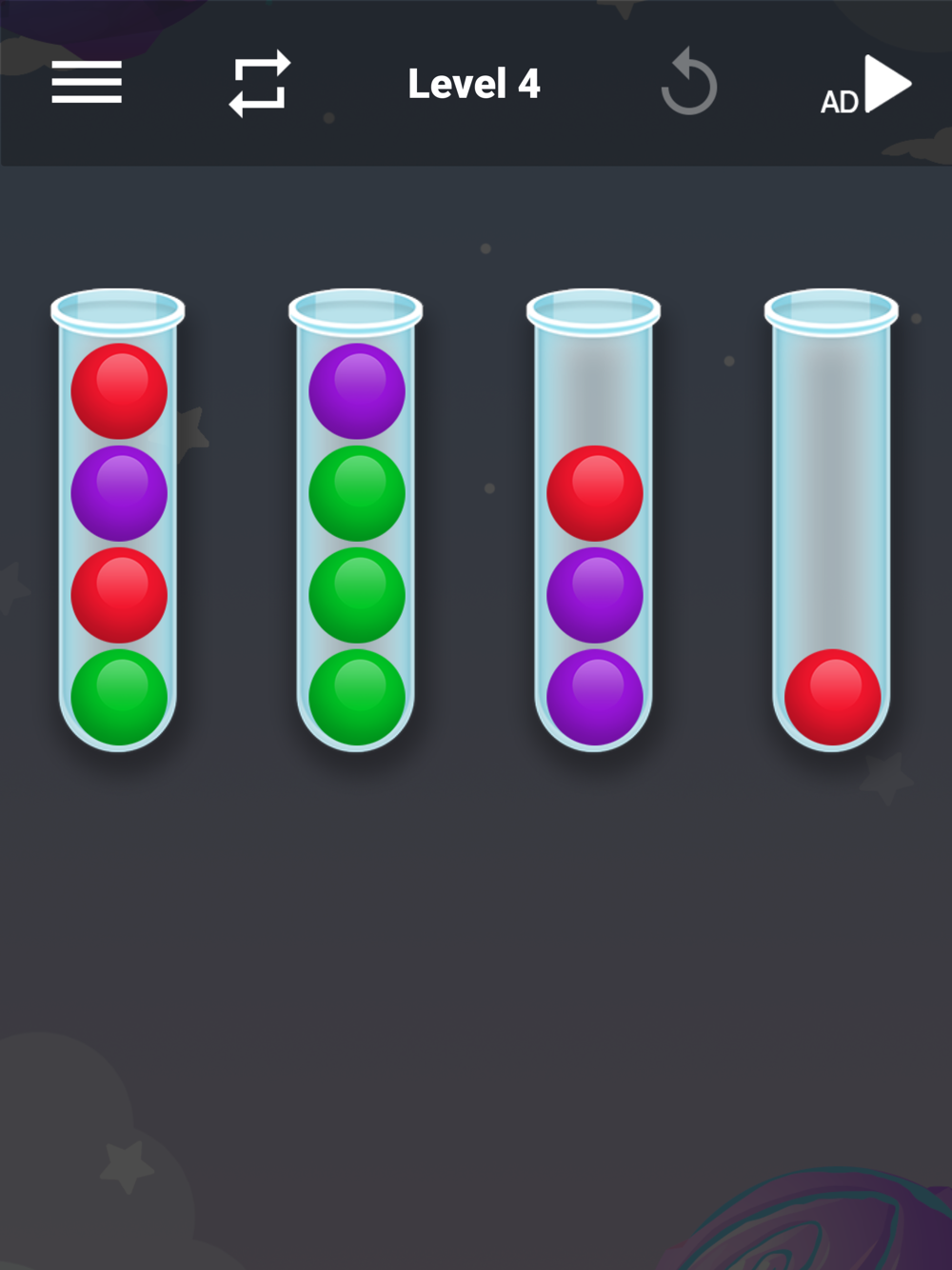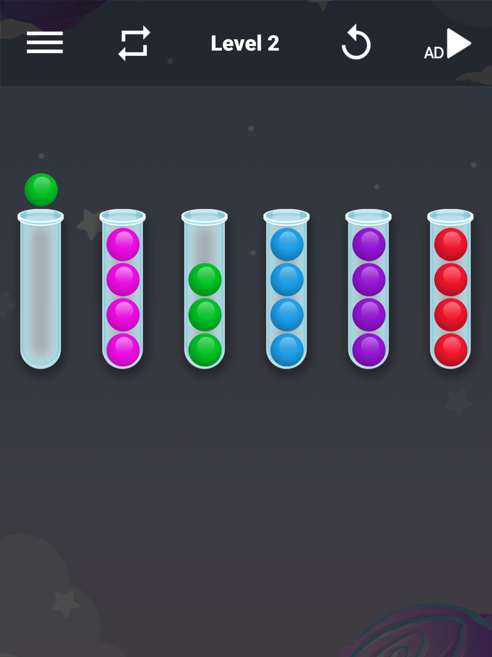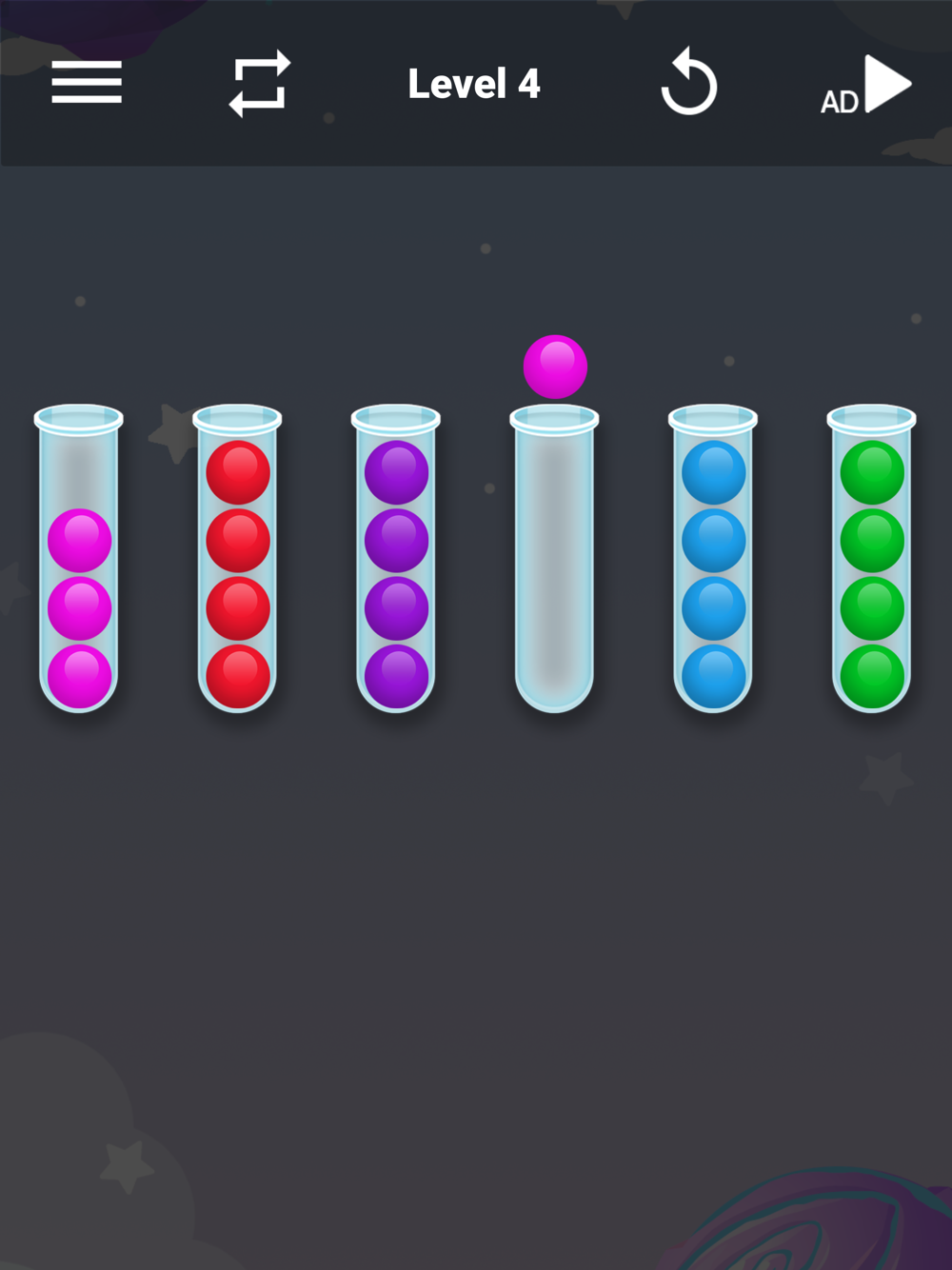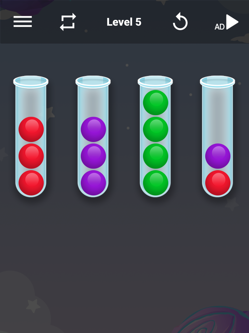 Sorting Strategy: To solve the puzzles, you'll need to devise an effective sorting strategy. Analyze the colors and positions of the balls, and strategically move them between containers to achieve the desired arrangement. Experiment with different moves and strategies to find the optimal solution.