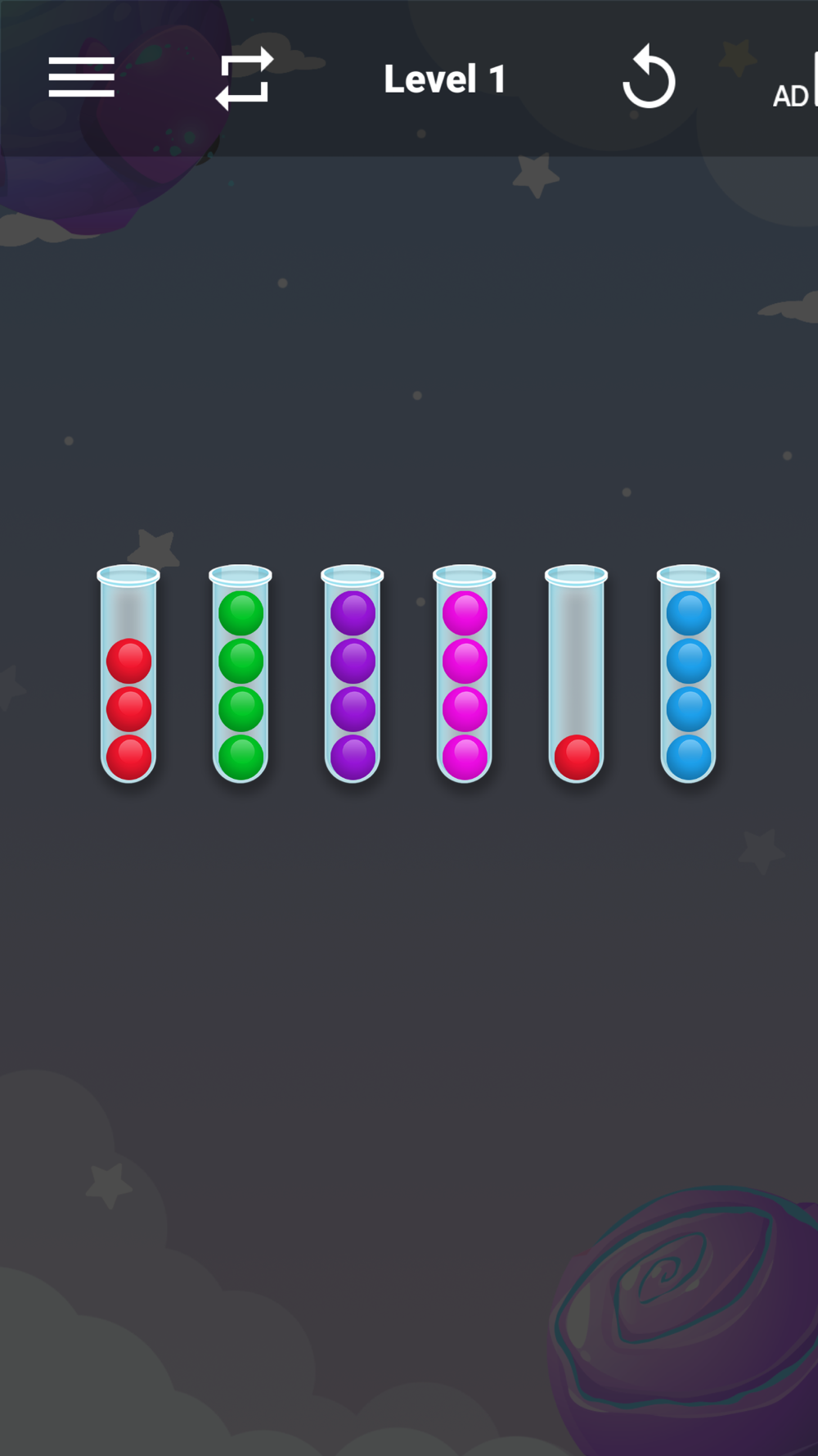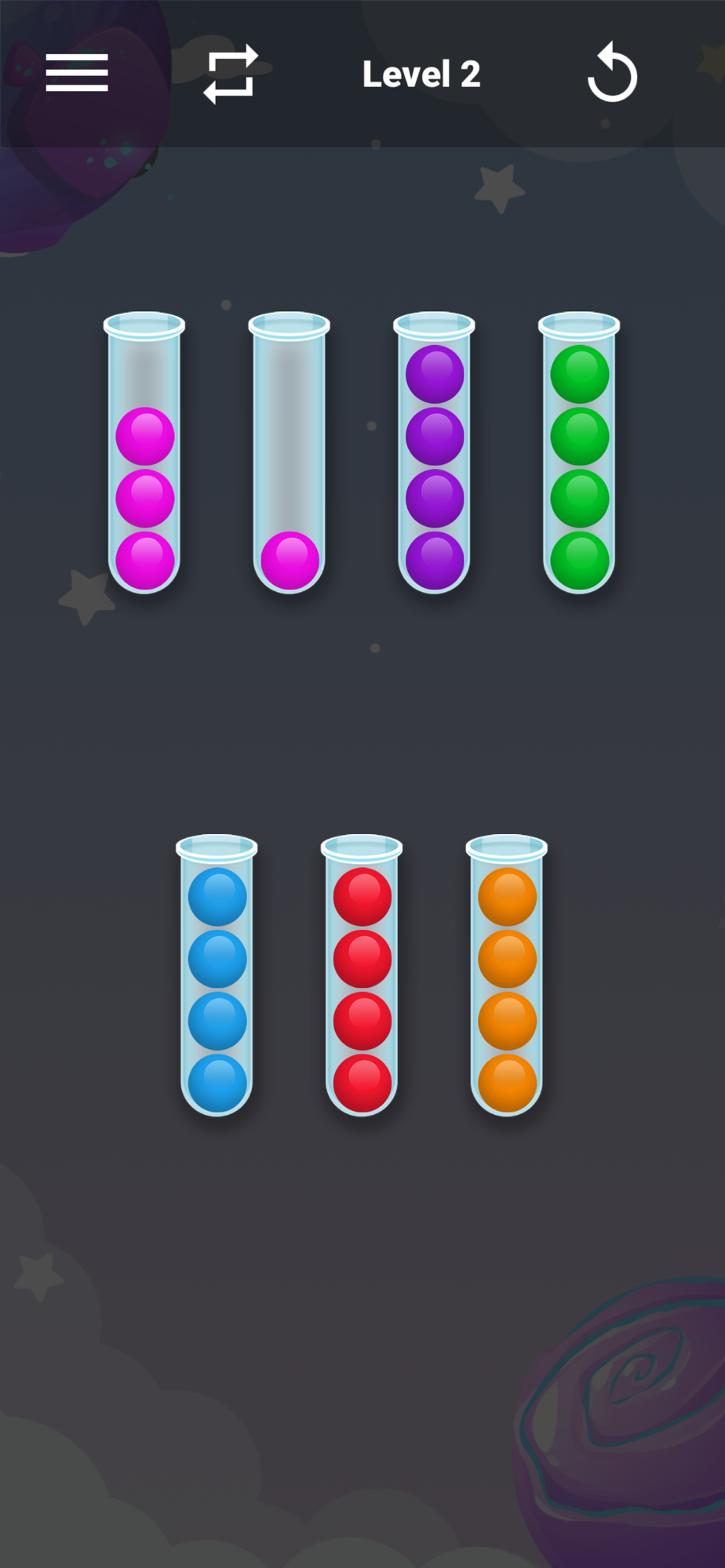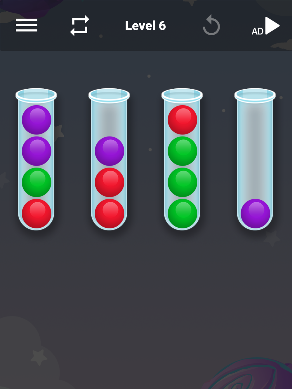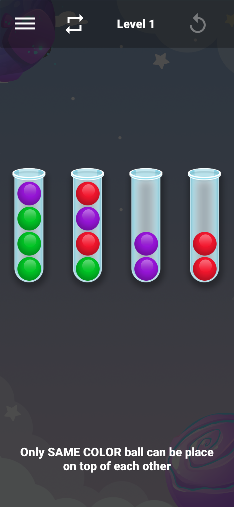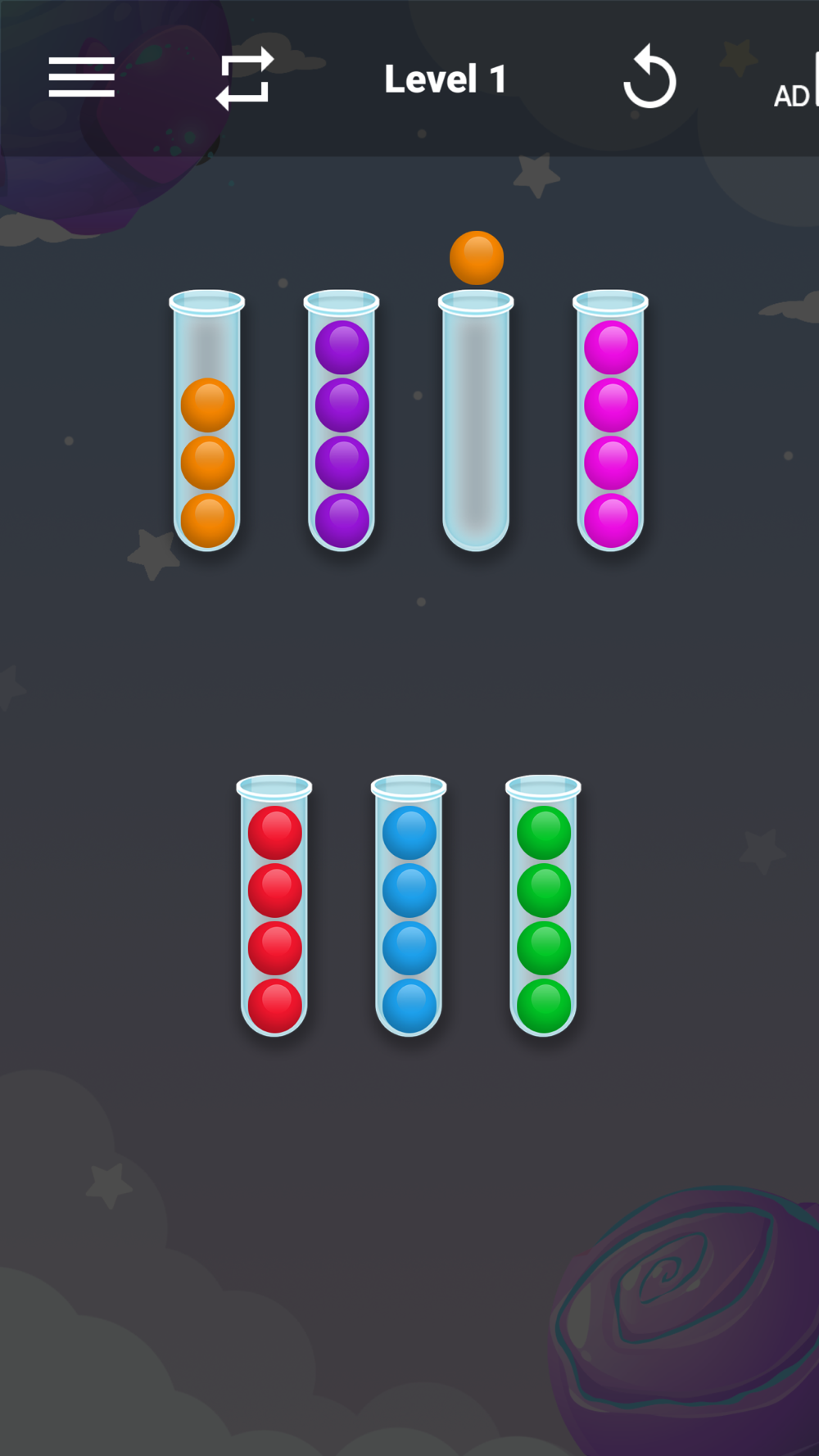 Sorting Strategy: To solve the puzzles, you'll need to devise an effective sorting strategy. Analyze the colors and positions of the balls, and strategically move them between containers to achieve the desired arrangement. Experiment with different moves and strategies to find the optimal solution.