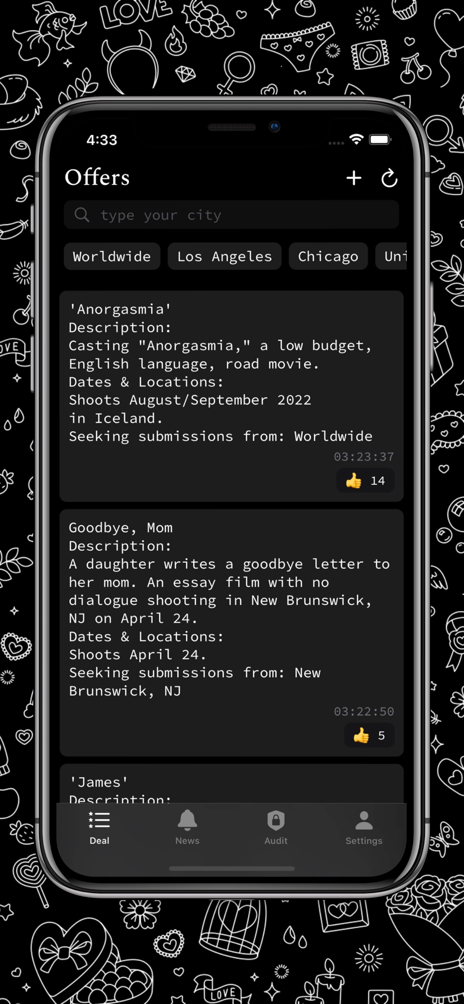 No.Chat is a handy platform to keep track of all filming offers in different cities and countries. We offer a single application to replace the outdated format of Telegram and WhatsApp groups. No more searching and monitoring offers in hundreds of groups. Go to the application and select your city, then you will see all the available options for work.