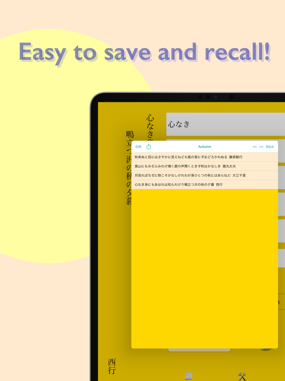 “Tanka Note” allows you to easily write down and save your tanka. You can use five lists to save your tanka: spring, summer, autumn, winter, and no season.