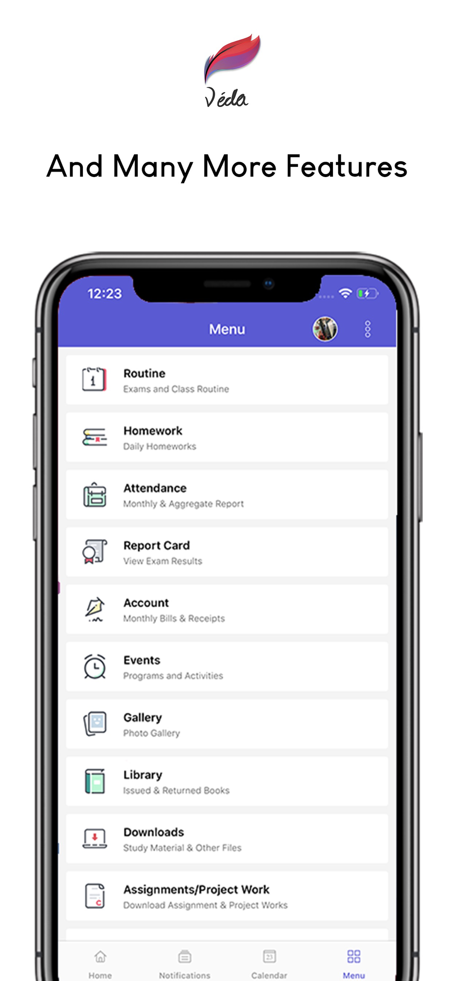 - News & Events to see the events happening in school/college and also add an reminder.