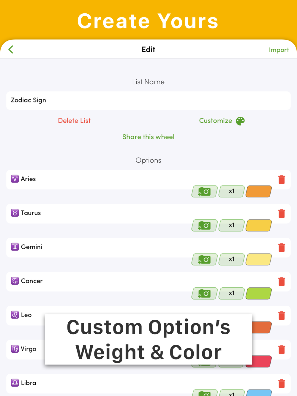 Create your question, add answers, spin the wheel and see what comes up! Very entertaining and lots of setup options for any personal preferences! FEATURES: - Create custom wheels - Share your wheels with friends - Use your photos on a wheel - Set option weight 1...100 - Tap segment to disable it - Spin the wheel with your fingers - Playoff mode (non-repeating mode) - Share your results with cool effects to social media - Shuffle wheel segments with just 1 tap - 30 built-in wheel templates - Simple and intuitive design - Colorful antistress therapy Example usage of the app: - Dinner wheel - Decide who will take the backseat next drive - Art/story generation - Randomising exercise for students - Giveaway/raffle chooser - Slime ingredients shuffle - Twister assistant - Tabletop/board games helper utility - Name, number, color generate and so much more! With "Playoff" mode (or non-repeating) you can make a list with names and choose one after another randomly without repetitions (until list ends). This is very useful for giveaways, whishlists, teammates shuffle, etc.