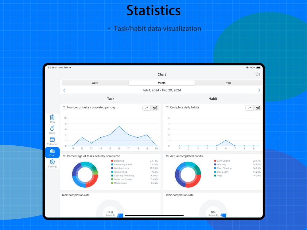 4. Statistics: The application will generate statistical reports based on the user's task and habit completion, such as the number of tasks completed, habit formation, etc. Users can view their progress and thus adjust their strategies to better achieve their goals.