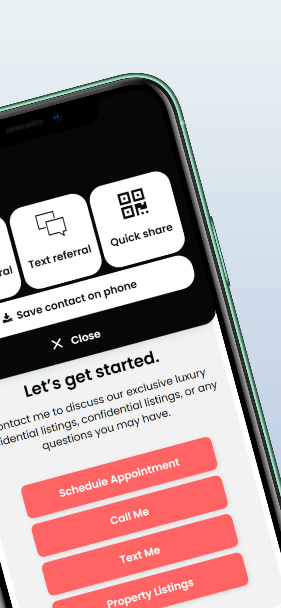 • Through our text and email referral buttons, you set a custom referral message for friends to send to their colleagues with your profile attached. In seconds, a group text is created with warm introductions.