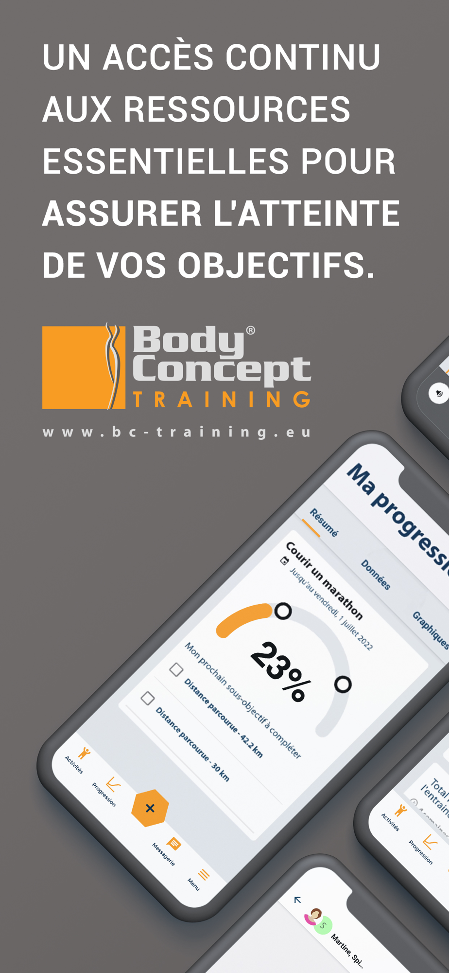 Cette application a été conçue pour les clients des professionnels de la santé physique et de la forme utilisant l'application de Body Concept Training.
