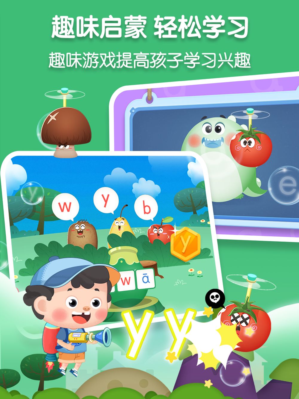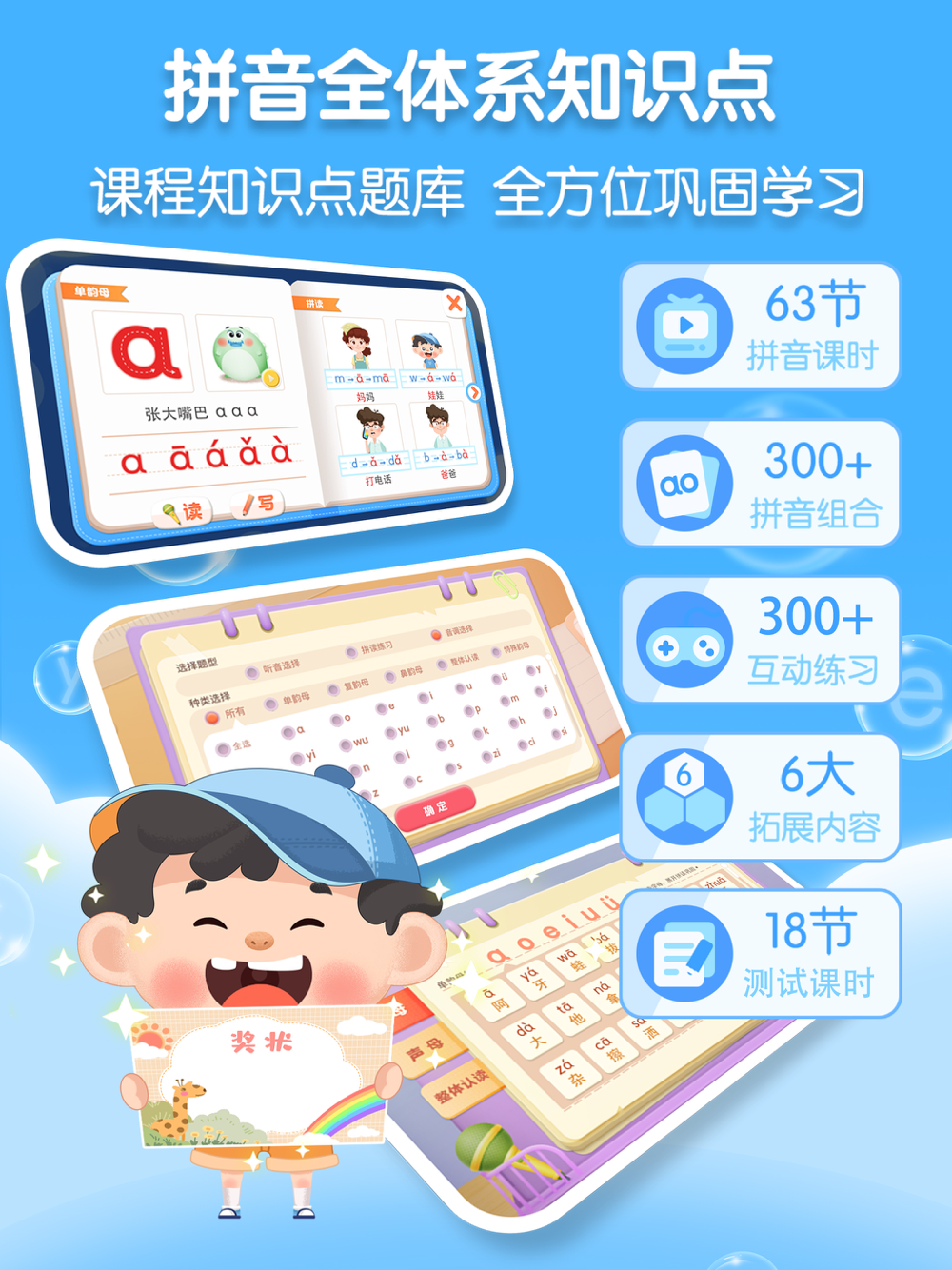 内容涵盖:252个课内拼读词语拓展、2500+汉字拼读拓展、63个原创拼音儿歌、18个易混淆知识点拼读强化规则、300+互动小游戏、63个字母录音训练、63个字母书写。