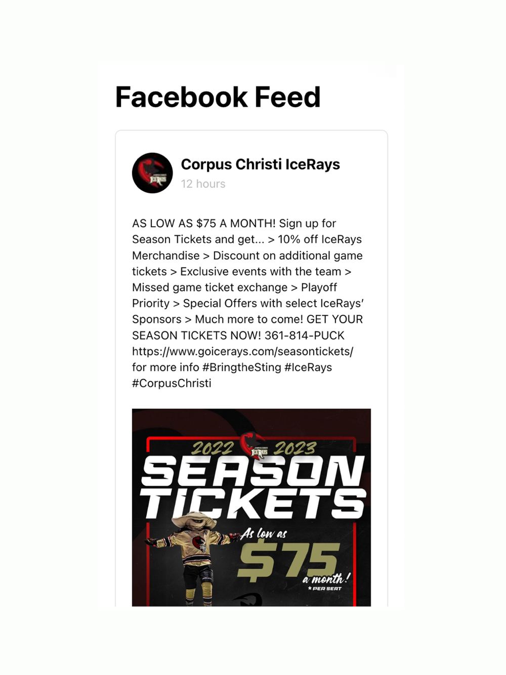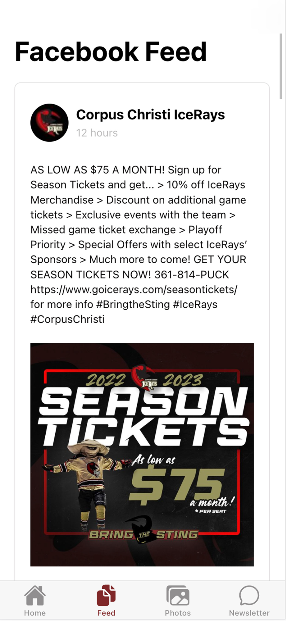 IceRays Hockey is now available on all smartphones. You can easily navigate through all of your favorite Social Media Galleries and see updated pictures. Stay up to date on what's going on with the Corpus Christi IceRays Hockey Team all season!