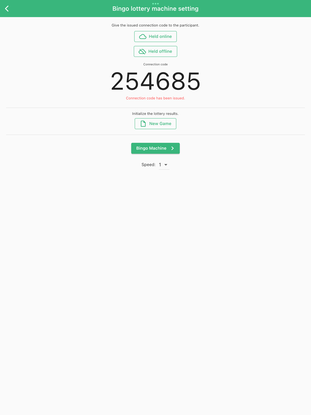 The organizer issues a connection code in the lottery machine settings and informs the participants.