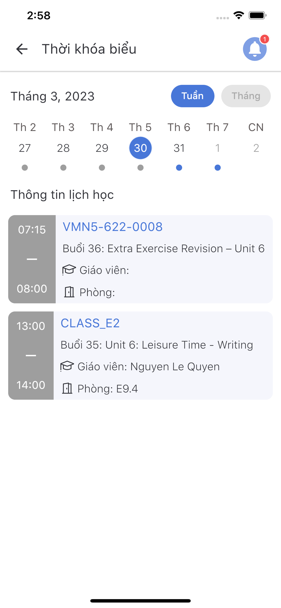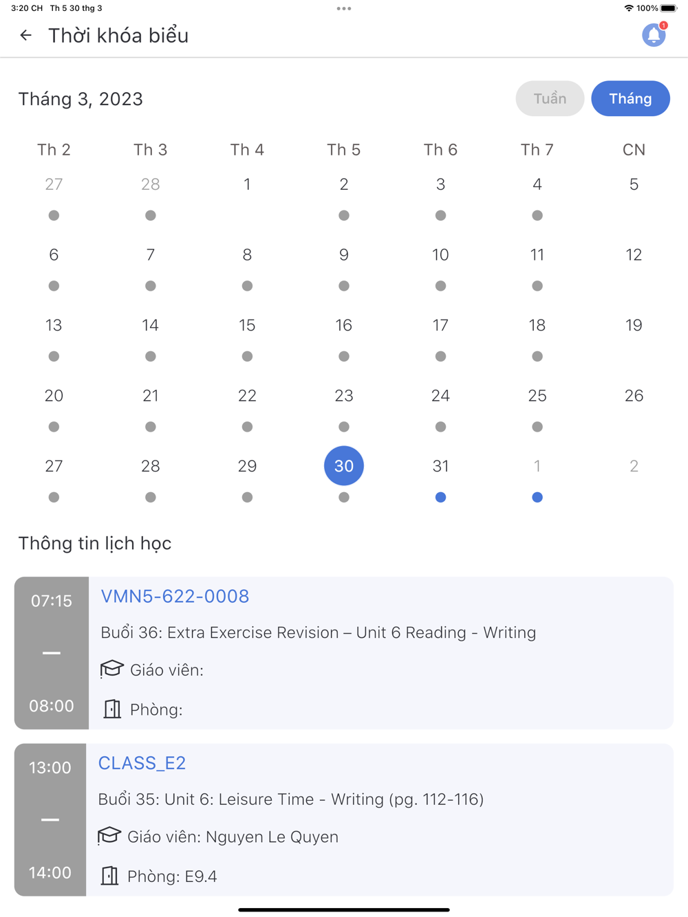 2. THEO DÕI LỊCH HỌC – Xem lịch học của tất cả các lớp bạn đang tham gia với thao tác này.