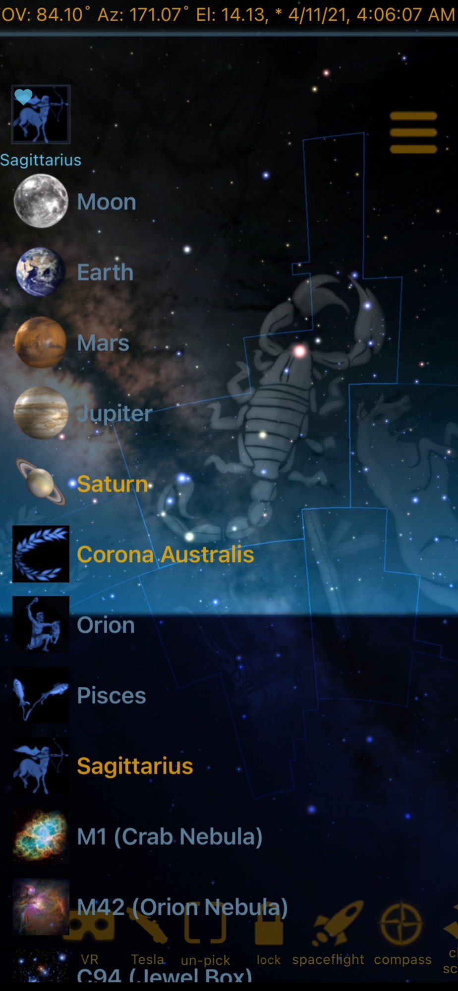 •Touch the sky to reveal hidden data for each object