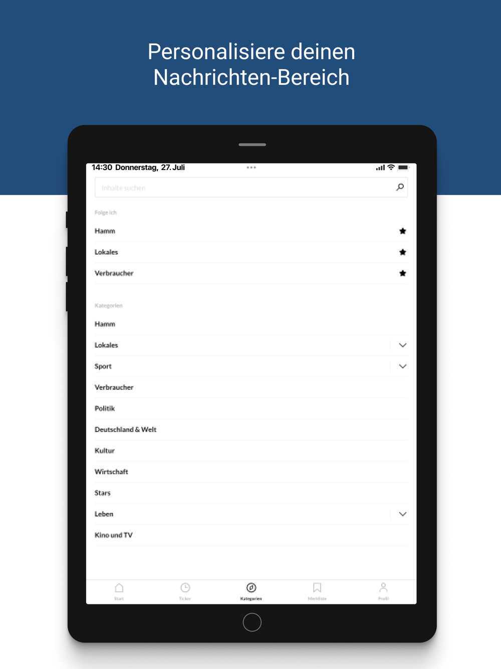 Richten Sie sich zudem Ihre Startseite nach Ihren Wünschen ein. Wählen Sie Ihre Interessensgebiete und Sie bekommen beim Öffnen der App direkt die aktuellen Nachrichten aus diesen Ressorts angezeigt.