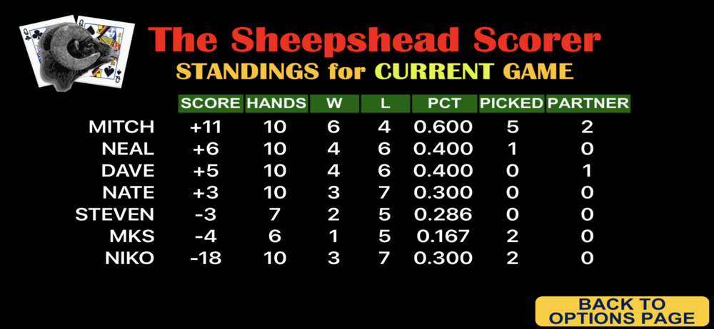 The Sheepshead Scorer app can now make scoring your Sheepshead card games a lot easier. Up to seven players can be entered and it can score individual hands of three to seven players.