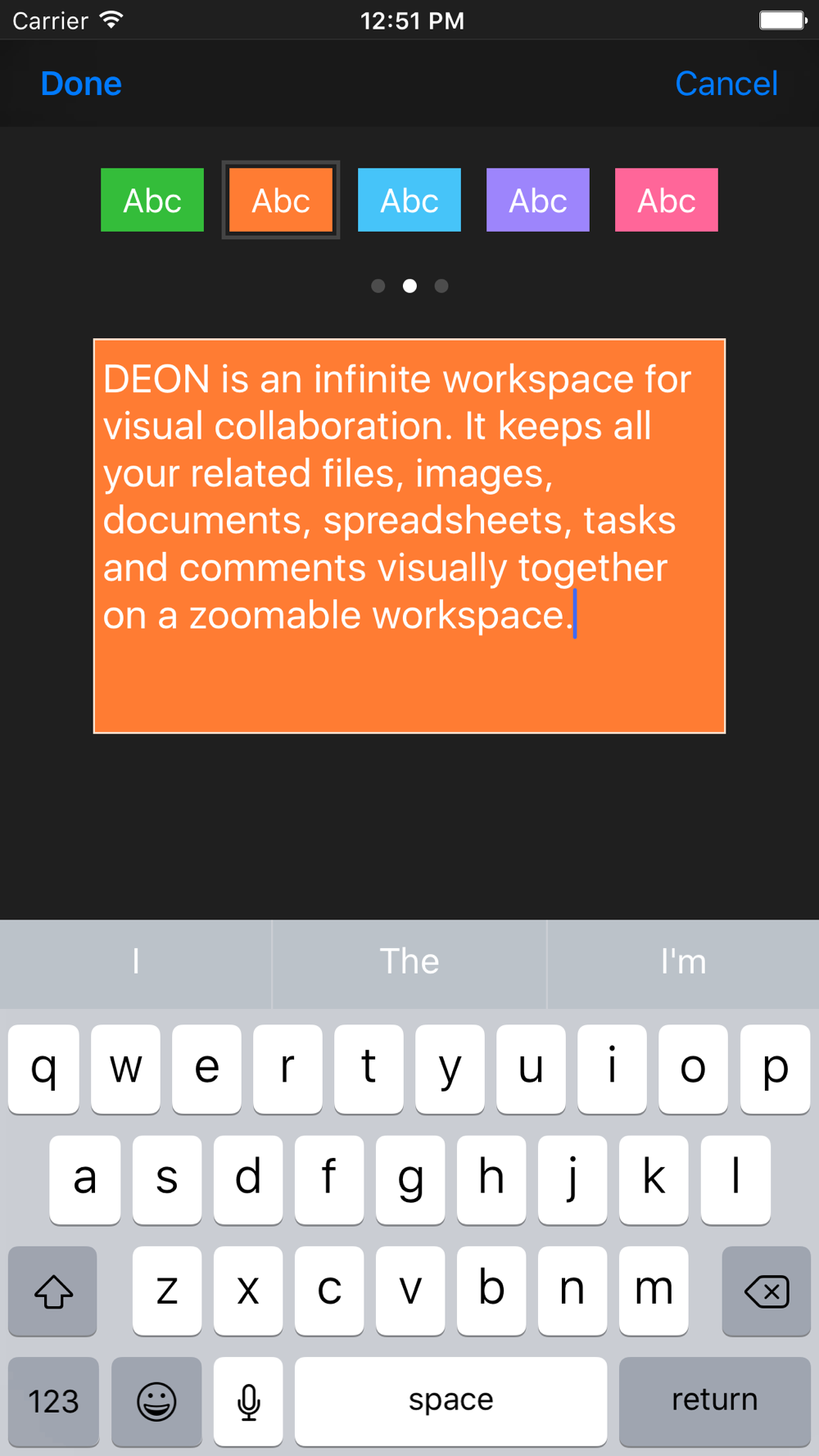 With Deon Lite you can manage your Deon Projects. You can also add content to your Projects. Upload images from your gallery or PDF documents you have on your iPhone / iPad. Create freehand drawings or sticky notes.