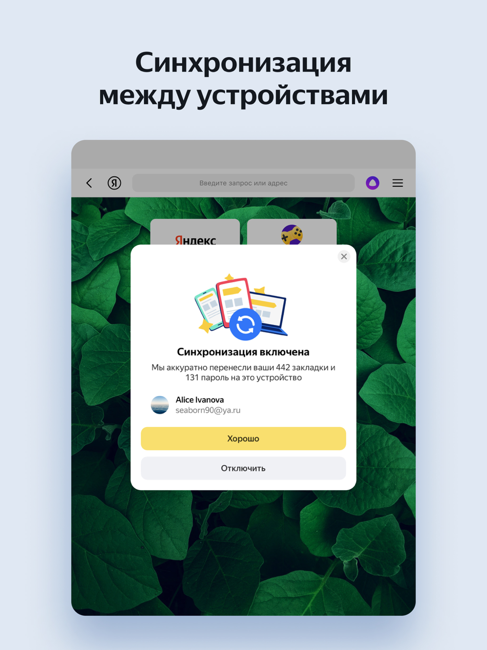 Syncing with a Yandex account will automatically transfer Yandex Browser bookmarks for your computer to your mobile device.