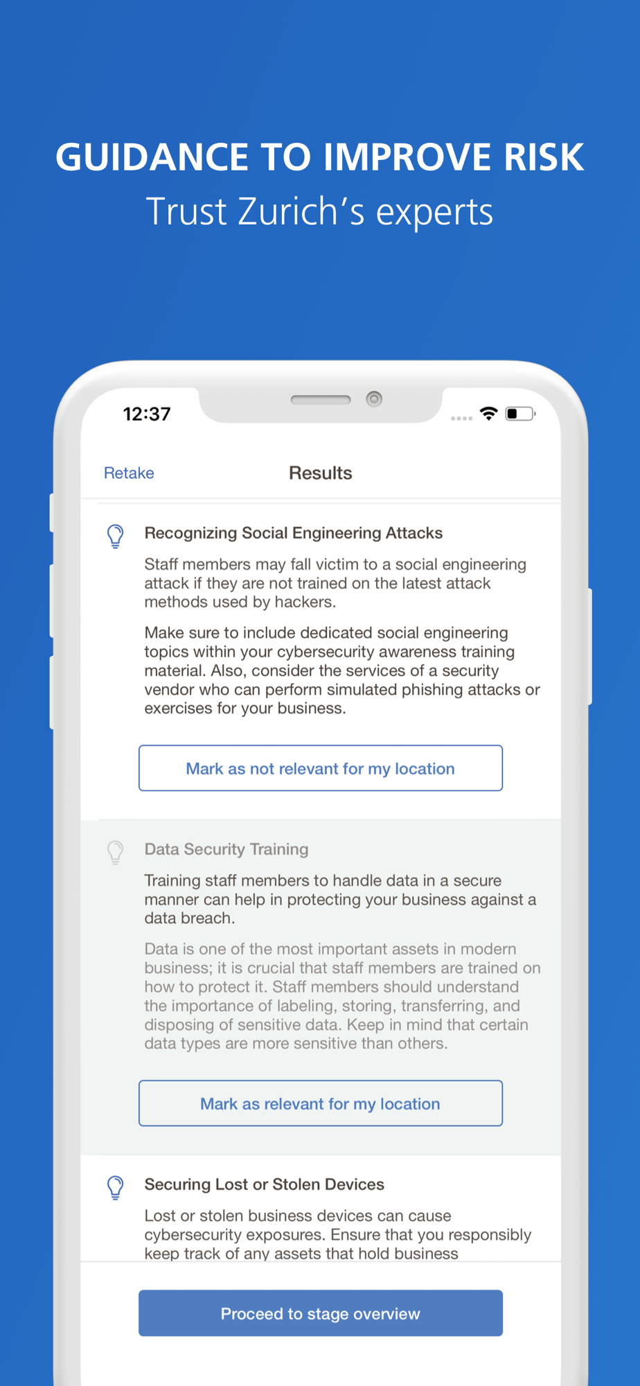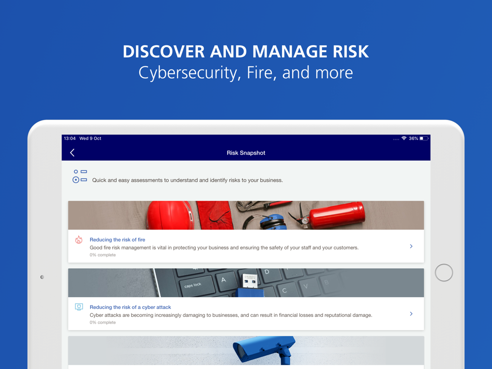 Zurich Risk Advisor’s tools and expert guidance make risk management easy, covering key risks such as Cybersecurity, Fire, Flood, Employer’s Liability, Workers Compensation, Motor Fleet, and more. Built with the knowledge and experience of 750+ risk professionals, you can identify your risks and learn how to reduce them, all from your phone. All for free.