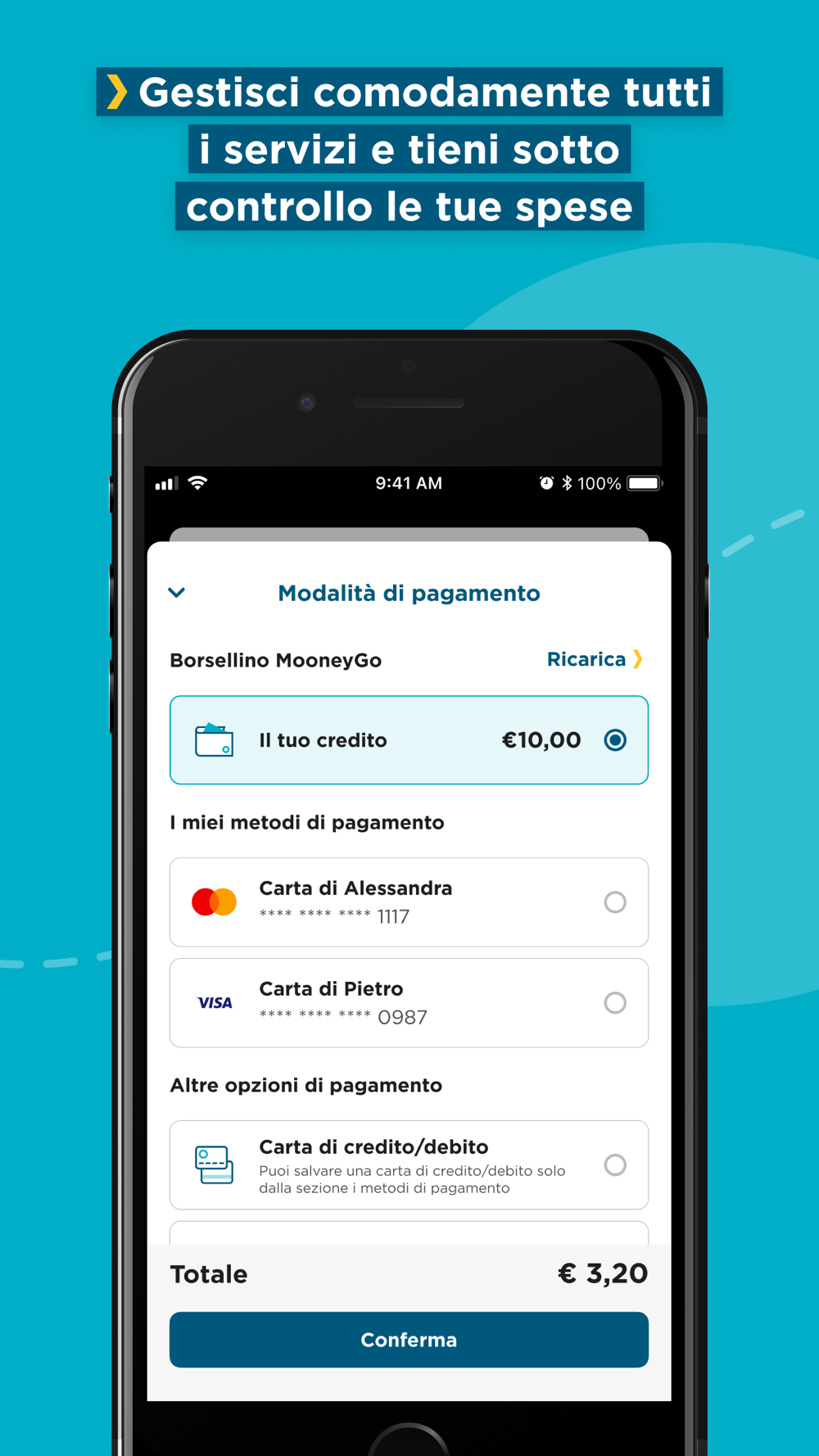 - Associa la tua carta di credito o debito Visa o Mastercard, o le carte prepagate emesse da Mooney per pagare i servizi utilizzati con il dispositivo, non è necessario un c/c bancario;