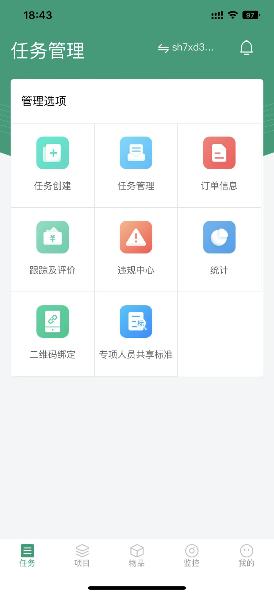 1、任务管理:包括巡视、任务、订单、违规、统计等功能