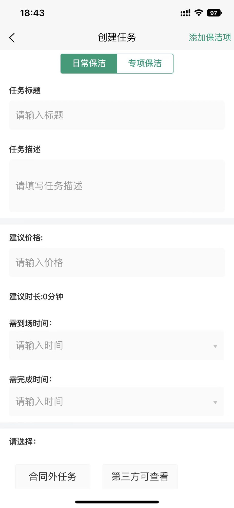 本应用为保洁服务商户端,供保洁公司发布管理其保洁业务信息。与之对应我们有保洁服务服务端,供平台保洁人员使用,通过服务端可以查看商户端保洁业务信息,保洁人员接单后去对最终需求用户进行保洁服务。