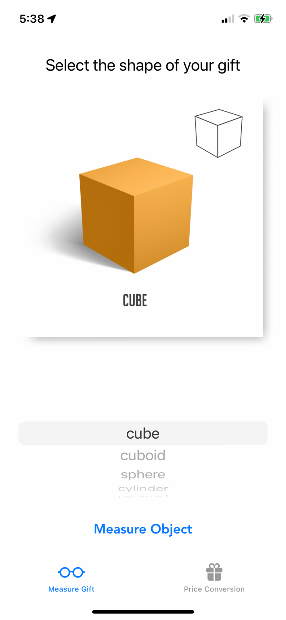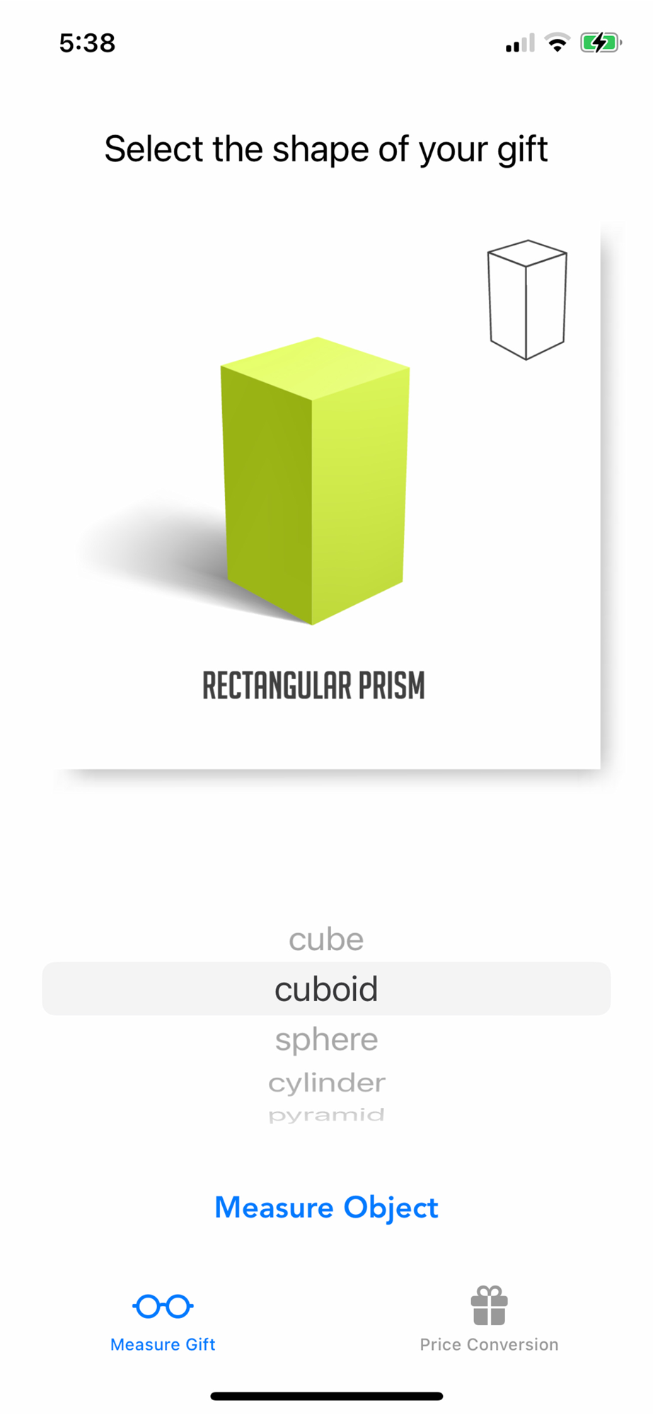 Augmented Reality measures large objects and returns length of wrapping paper needed for a selected geometric shape's lateral surface area.