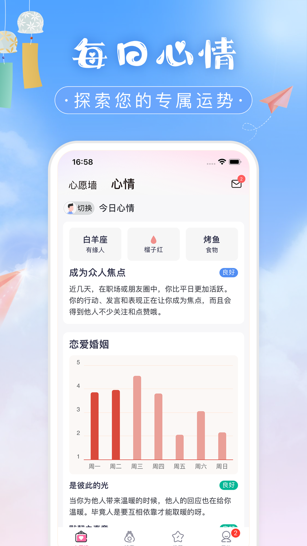 【运势解析】为用户提供个性化解读,涵盖每日及每周的专属运势分析,深入洞察您的运势趋势。