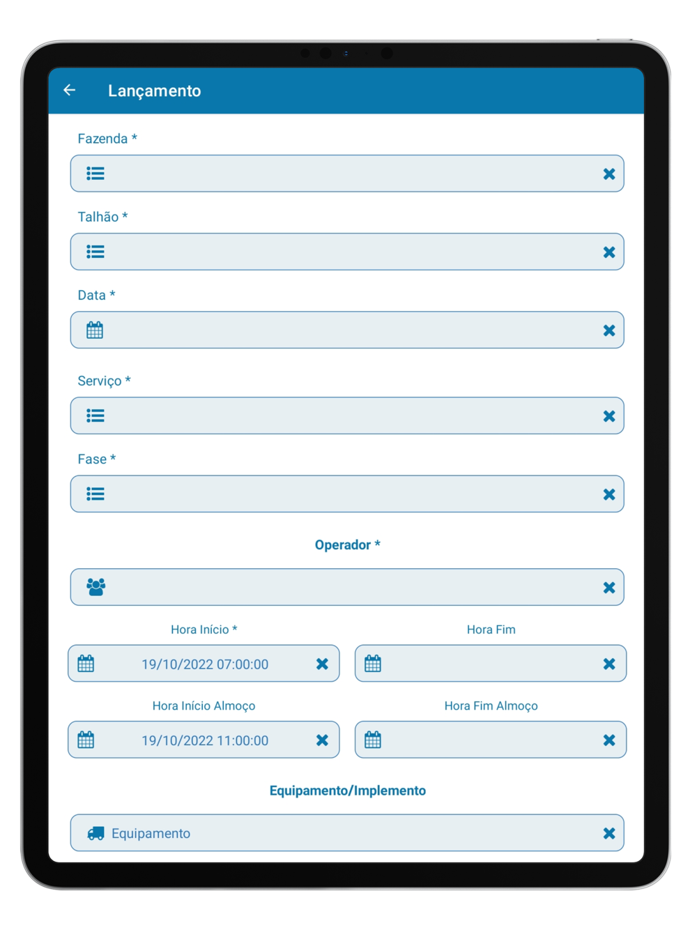 - Lançamento de horas para equipamentos.