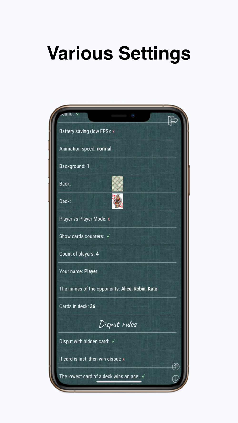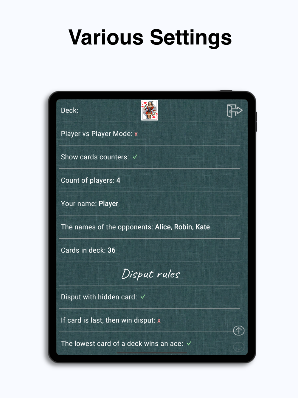 The deck is divided evenly among the players, giving each a down stack. In unison, each player reveals the top card of their deck—this is a "battle"—and the player with the higher card takes both of the cards played and moves them to their stack. Aces are high, and suits are ignored.