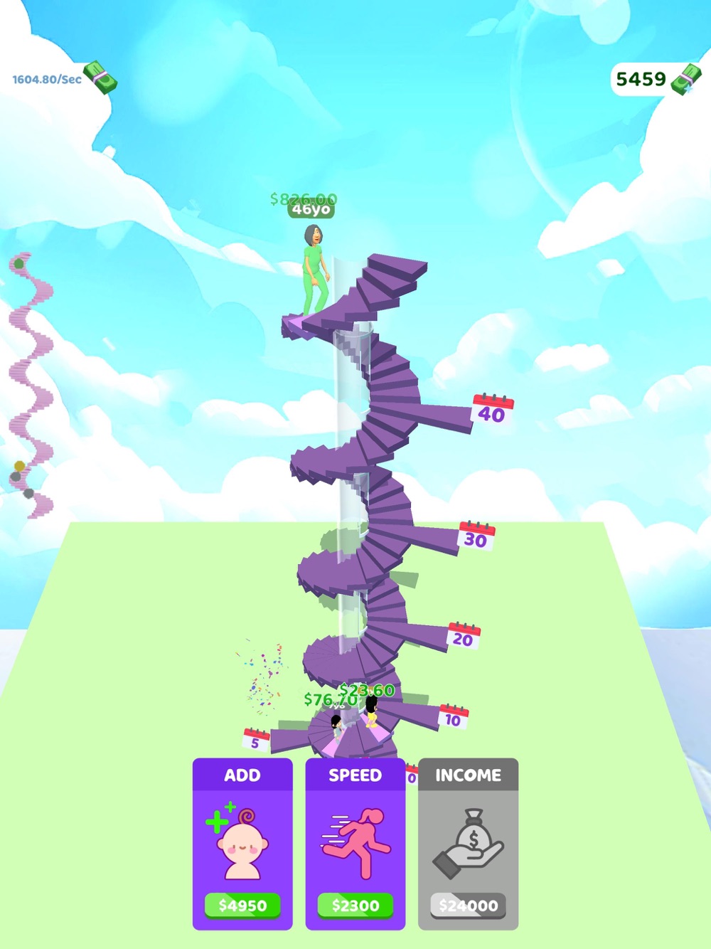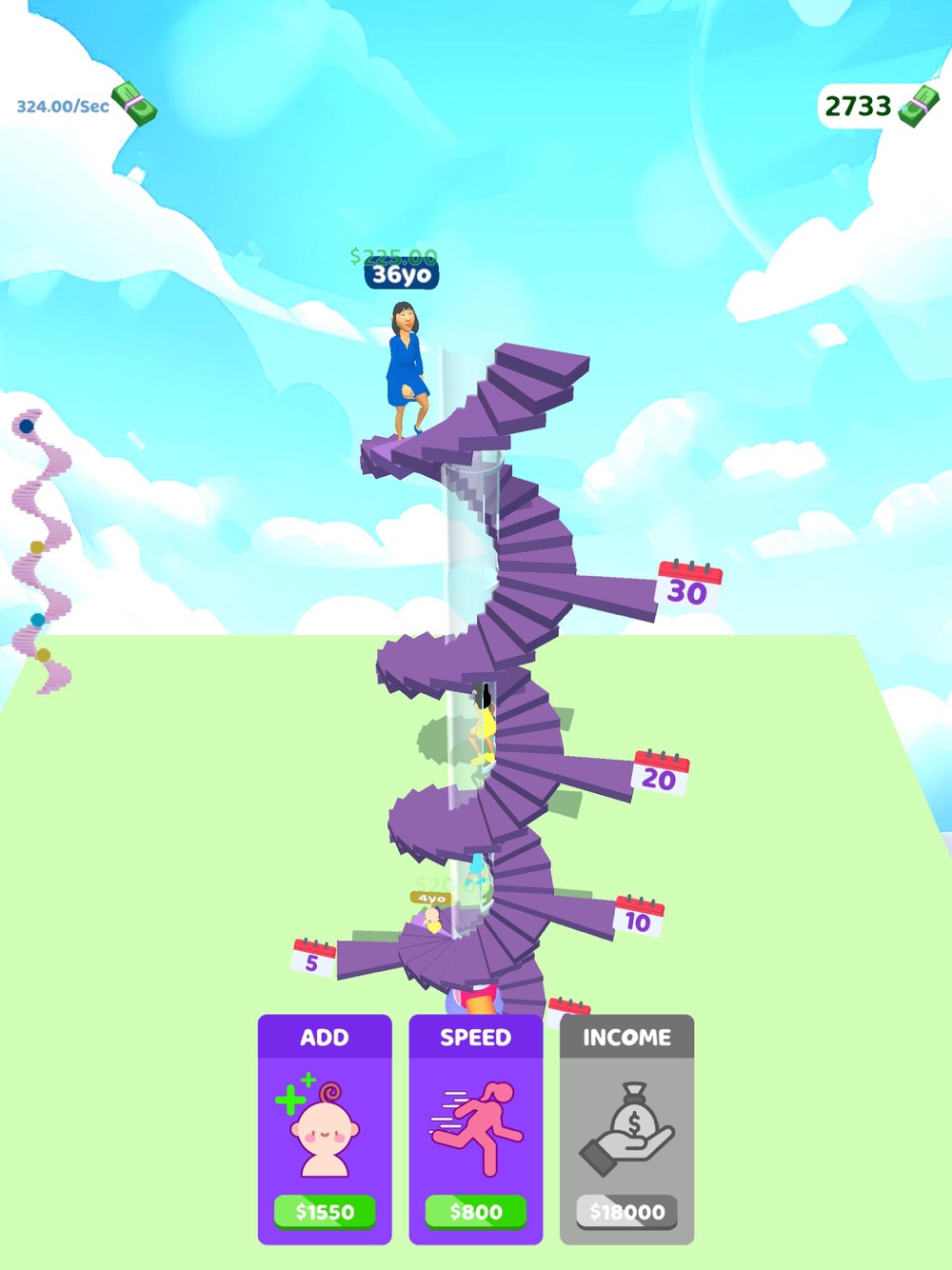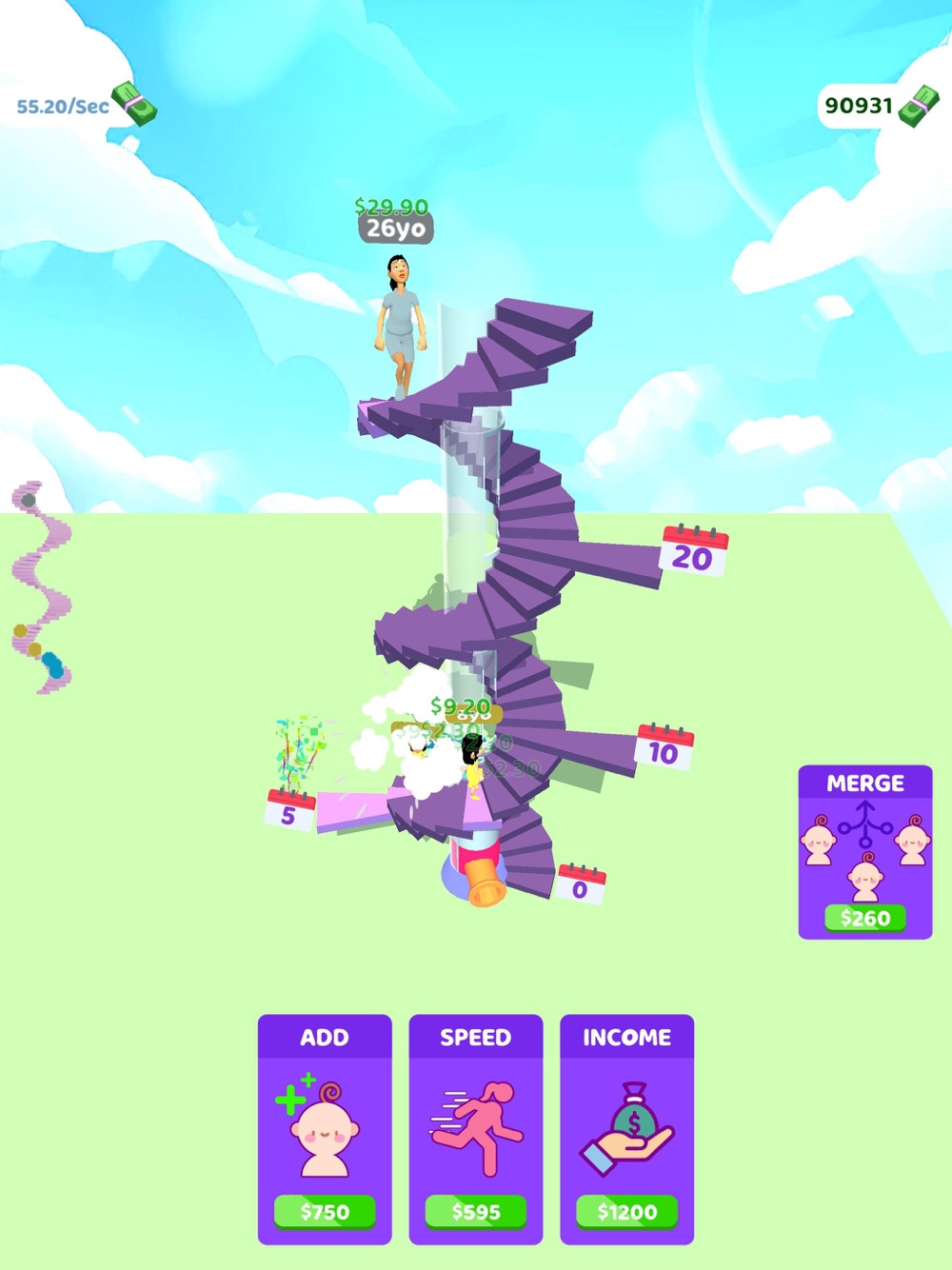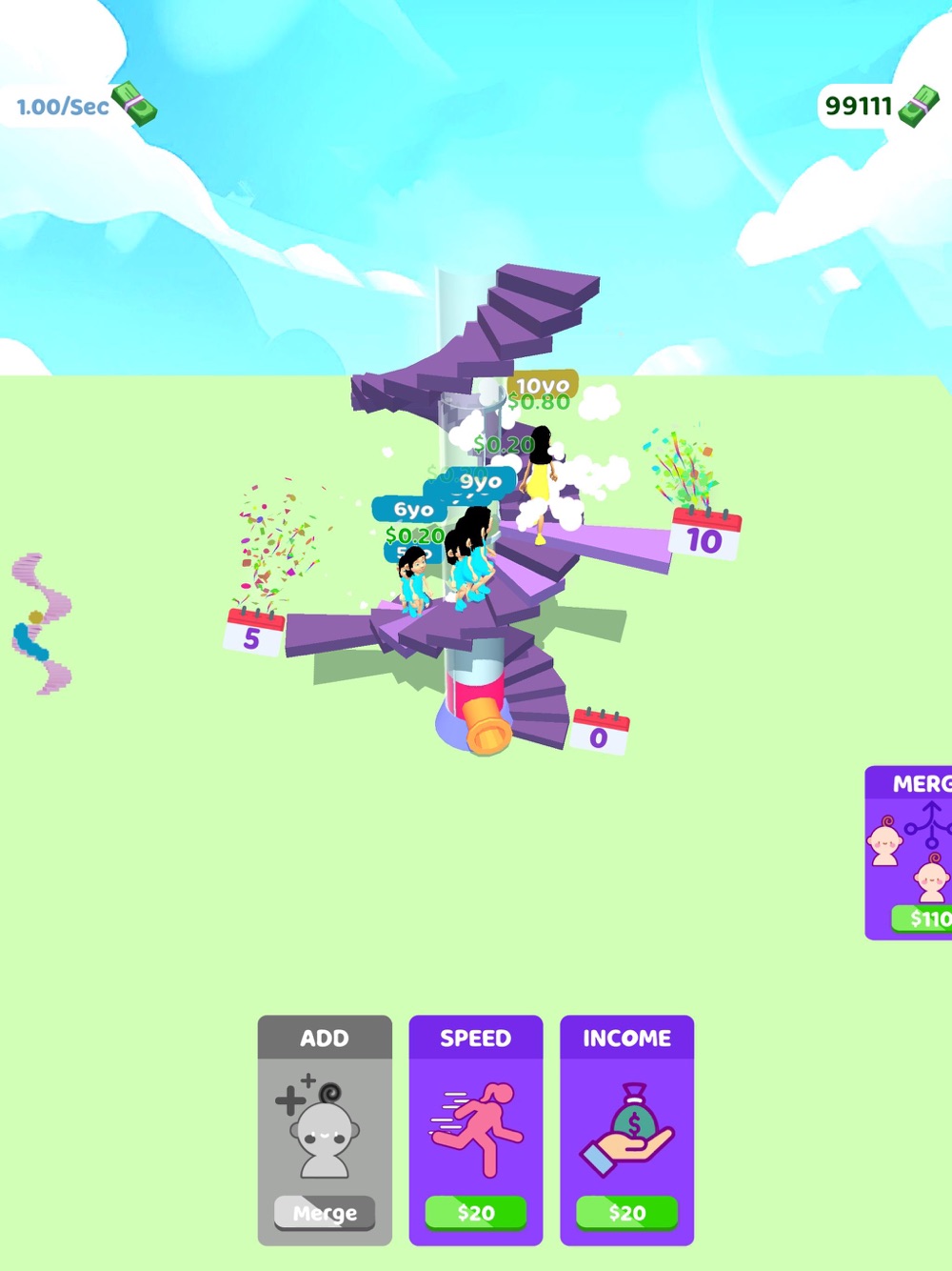 Add new characters to the journey of life! Every color represents a different length of life! You can merge your characters to make them go further and earn more money when you have 3 of them in the same color.