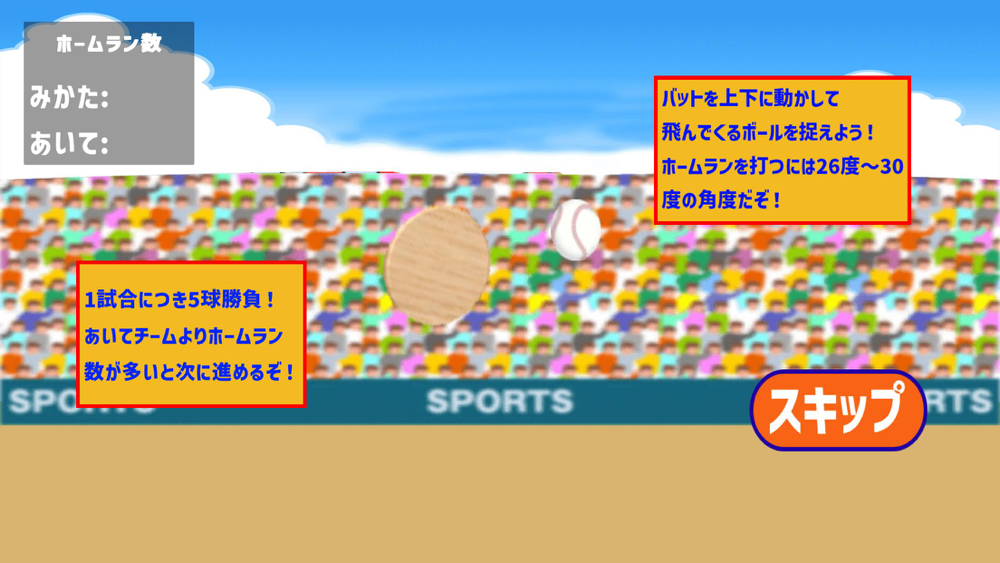 バットを上下に動かして投げ出されるボールをヒットさせホームランを狙う簡単ゲーム!