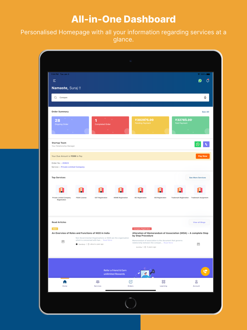 · Place your order for Company Registration, Corporate Compliance, Government registration or any other legal / tax related services.