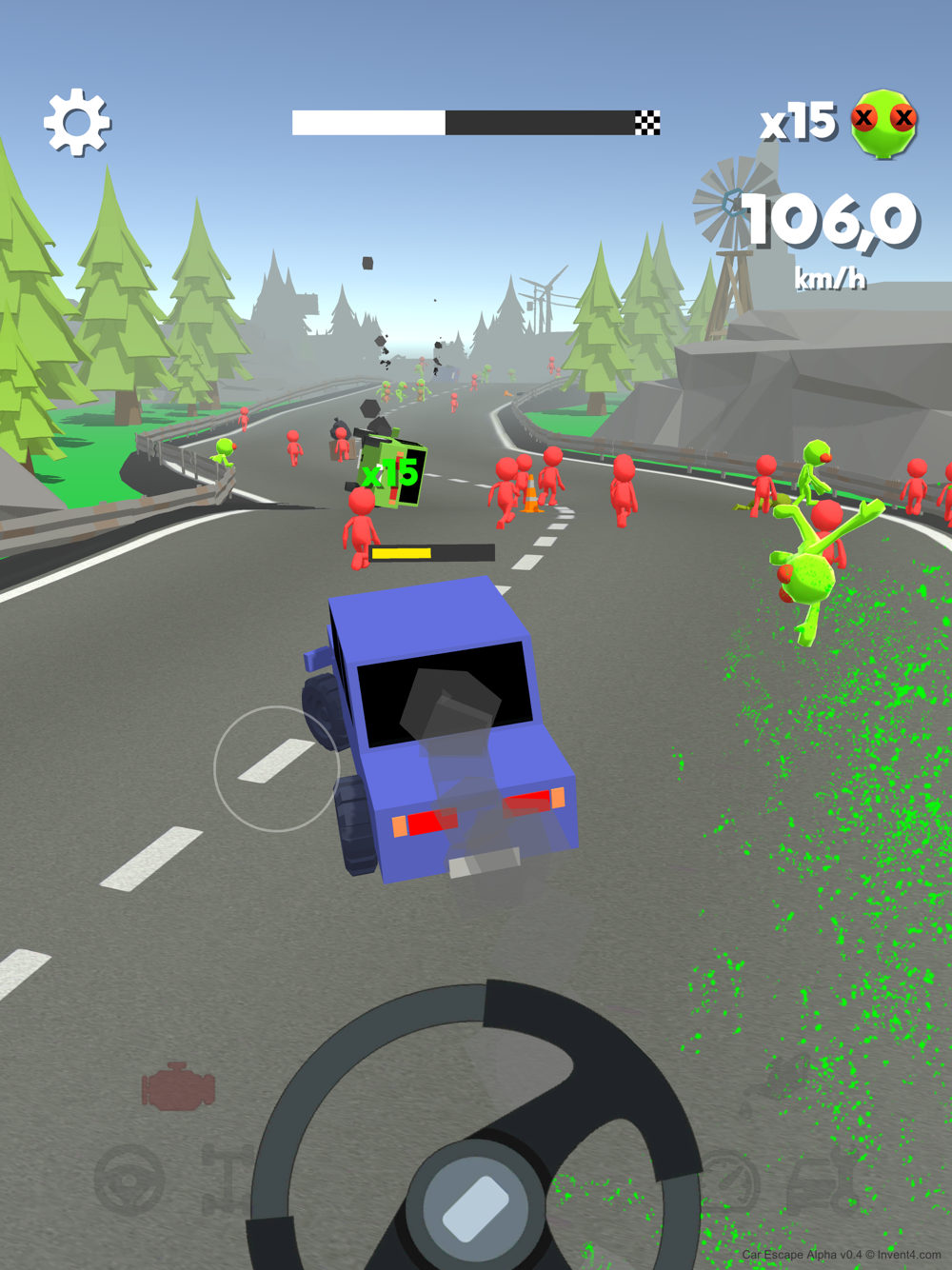 Get in your car to escape a Zombie invasion. If you run over some zombies, that’s great, but please avoid the innocent crowd trying to escape too.