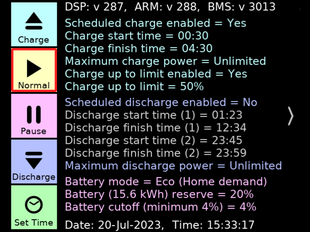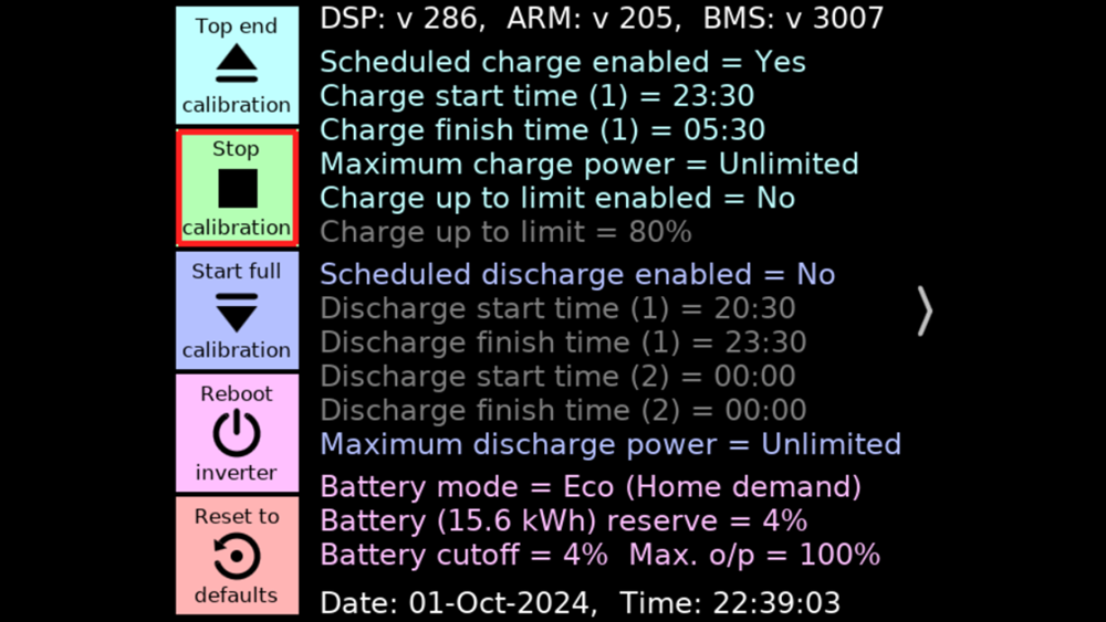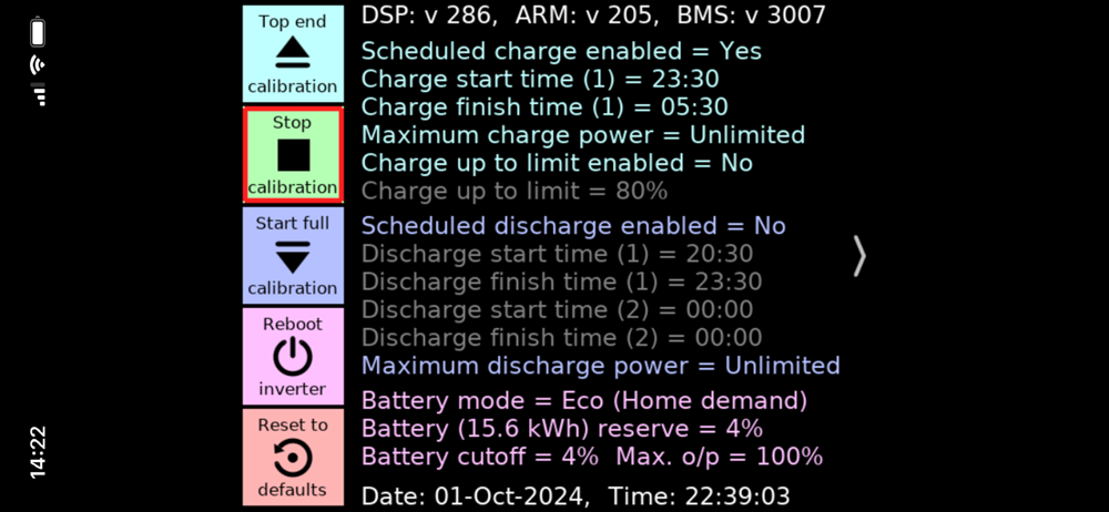 v1.31a enables manual settings changes even when the inverter is in an 'abnormal' state.New 'maintenance' mode in which you can Start (or stop) a battery calibration, Reboot the inverter or Reset to defaults.You can toggle this mode on and off by pressing and holding to the right of the Quick Settings buttons for two seconds.Added the 'Maximum Charge and Discharge Rates in percent' registers (removed 'Output priority mode' to make space).An issue affecting setting the inverter's clock, when running recent inverter firmware, has been resolved.