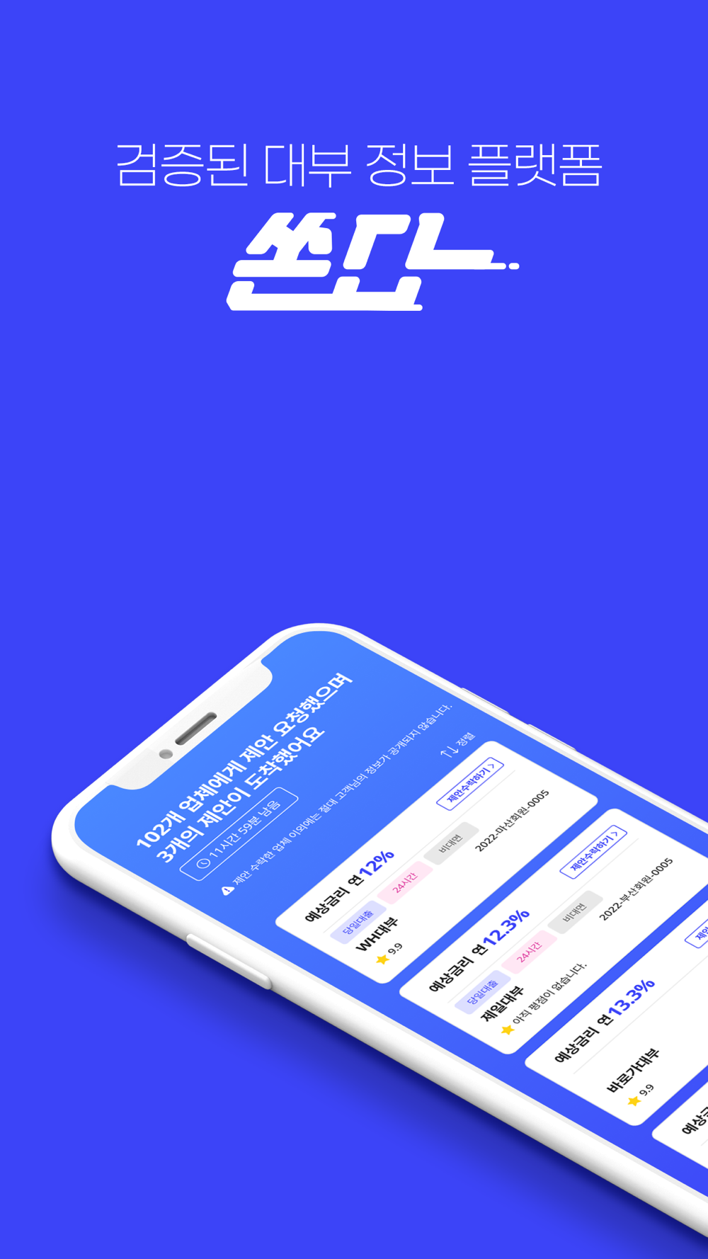 쏜다는 대부정보 플랫폼 앱서비스만 제공할 뿐 직접적인 대출 및 중개를 하지 않습니다. 쏜다는 한국대부금융협회, 지자체 정식허가 업체만 업체 등록이 가능합니다. 쏜다에서 매칭된 업체는 대부(중개)업체가 제공하는 정보로서 이를 신뢰하여 취한 조치에 대하여 어떠한 책임을 지지 않습니다.과도한 빚은 당신에게 큰 불행을 안겨줄 수 있습니다. 중개수수료를 요구하거나 받는 것은 불법입니다. 대출 시 귀하의 신용등급이 하락할 수 있습니다.
