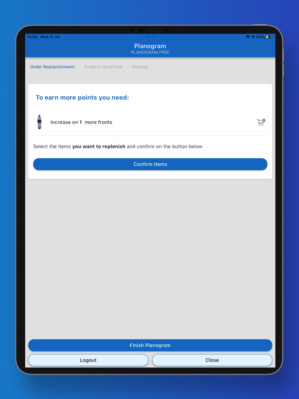 Changed the language of the SMS;Removed captcha verification;Fixed auto crop;Counted expected faces in "Missing";Removed a text from the app;Fixed phone invalid format;Fixed error displaying missing;Fixed camera icon in the planogram list going to preview and not to the camera;Fixed error displaying missing;Enabled the Gallery button for TestFlight installations;Set a threshold by the back office;Temporarily removed exposure controls;Changed status to "in progress" only when tapped on the camera icon or started capture;Corrected the second picture not being evaluated in the positioning list;Removed captured photo and summary buttons;Fixed evaluation of stacking products error;Fixed error on sync (error 4);Changed the display of the "Misplaced" tab;Automatically returns to planogram list after success sync;Enabled open section succes in feedback screen;