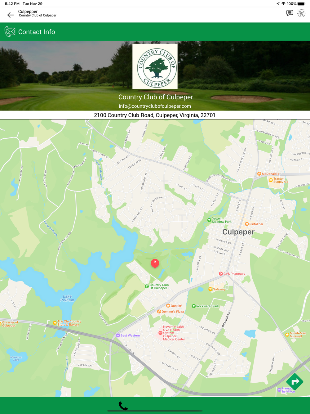 Country Club of Culpeper gives you access to an on-course rangefinder, live scoring system, course information, weather updates, tee-time booking service, and messaging systems functions. Additionally, the Country Club of Culpeper app may be used to sign up for events, view your membership portal, order food and beverage, and receive course promotions at Country Club of Culpeper.