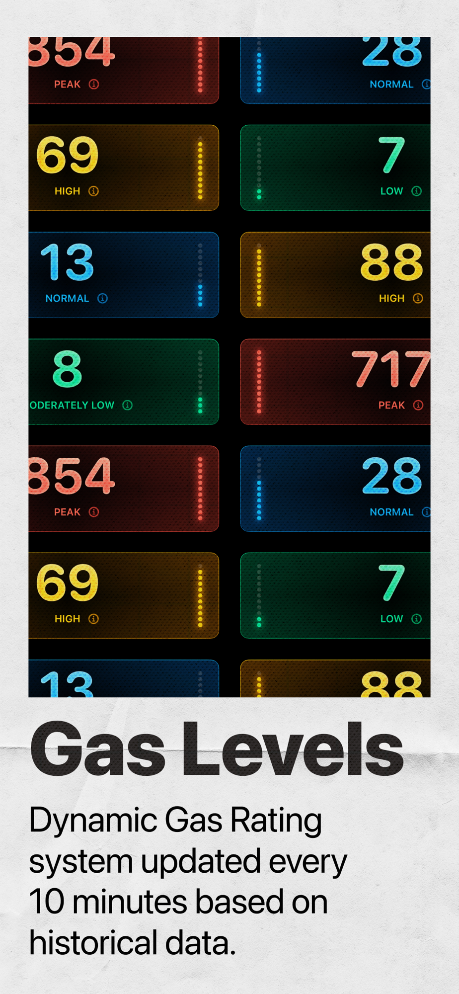 - Gas Level System: Stay ahead with our latest feature - a dynamic gas level system that calculates Ethereum gas prices based on aggregated data. This system provides a real-time assessment, indicating whether the gas prices are high or low compared to the typical values for the current time.