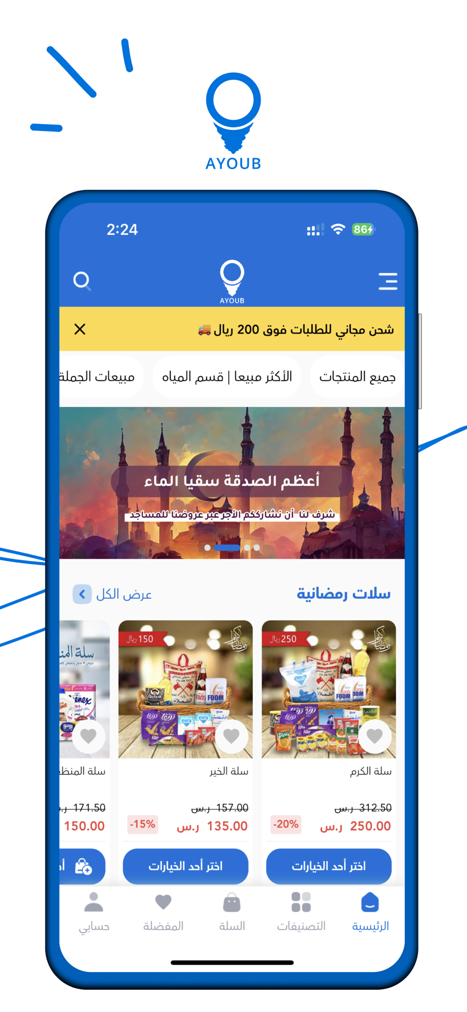 متجر ايوب هو متجر يبيع المياه الصحية والمرطبات والمواد الغذائية للمتسهلكين النهائيين b2c داخل مدينة الرياض فقط والذي يميزه انه يقدم اسعار مناسبة وخدمة مميزة مثل سرعة التوصيل وخدمة العملاء وتحميل الكراتين الثقيلة بدون اي رسوم وغيره من الخدمات التي تضيف قيمة للمستهلك...