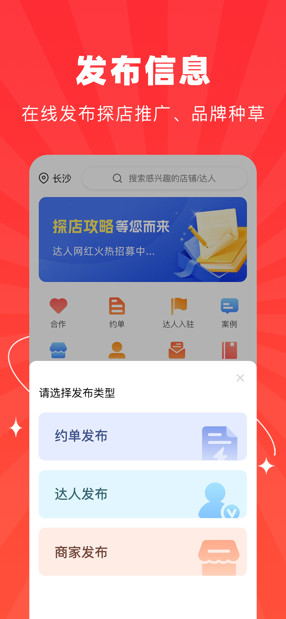 探店达人APP是一款专业为网红提供探店商机,为商家提供线上线下引流的互联网平台。只要你有粉丝,不管是微信、QQ、西瓜视频、抖音、百度、知乎、今日头条、小红书等,粉丝数量超过300,愿意分享周边美食、娱乐、商品资讯,即可申请成为探店达人。