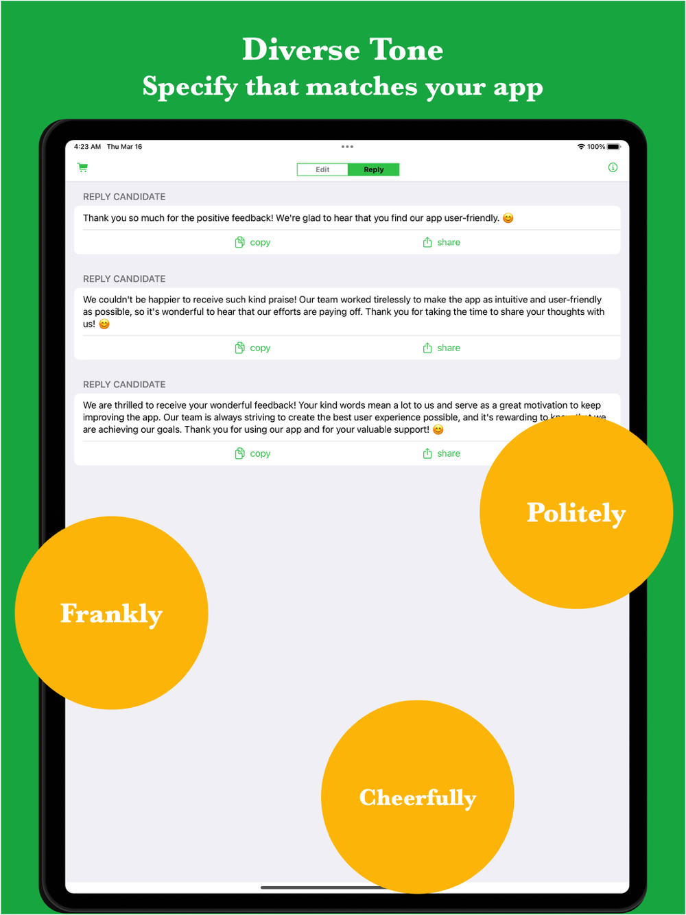 Reply AI is an app that automatically generates replies to user comments on AppStore etc.