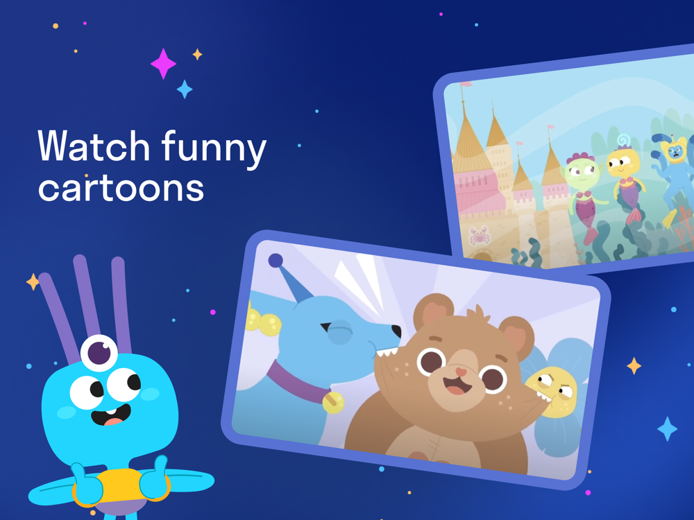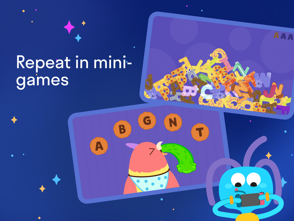 A bright image and animation accompany each letter to help children remember better. In engaging mini-games, we repeat letters to reinforce learning. As the kids progress, they can also access original educational cartoons from our school.
