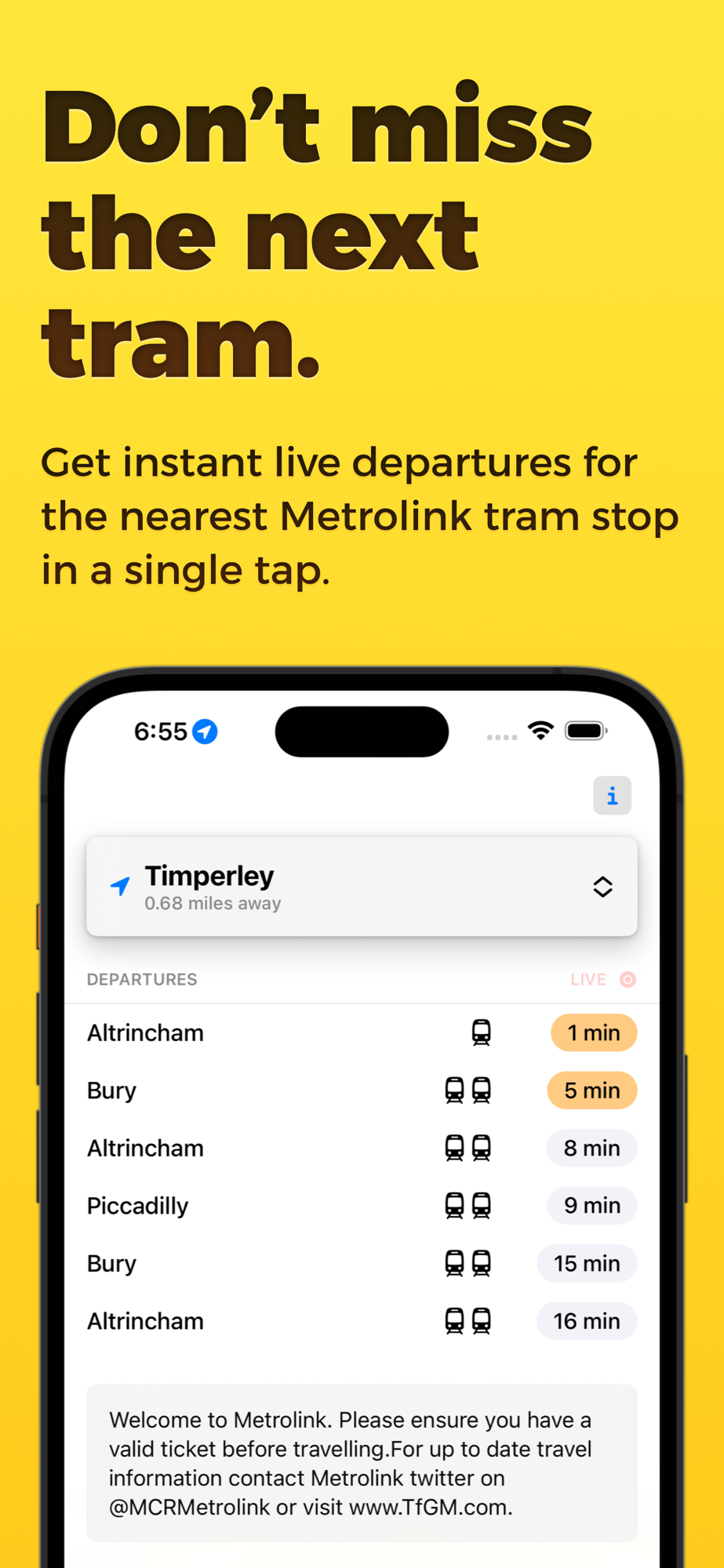 Discover the convenience of Tramspotter — your ultimate Metrolink tram companion! Always know when your next tram is arriving, save time, and avoid unnecessary stress.