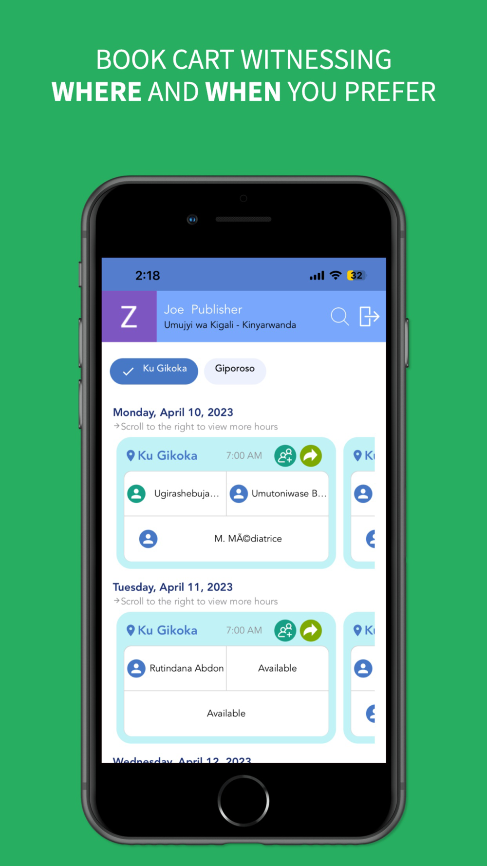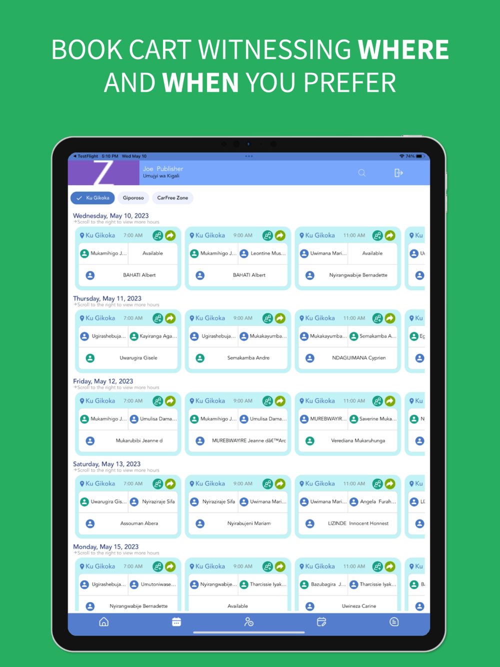 This is a simple and effect cart witnessing organizer app. It can help you to book where and when you want to participate in the cart witnessing, view your schedule, submit records of placements, communicate with others, and share experiences. Enjoy your ministry!