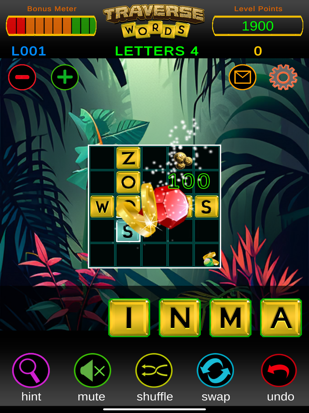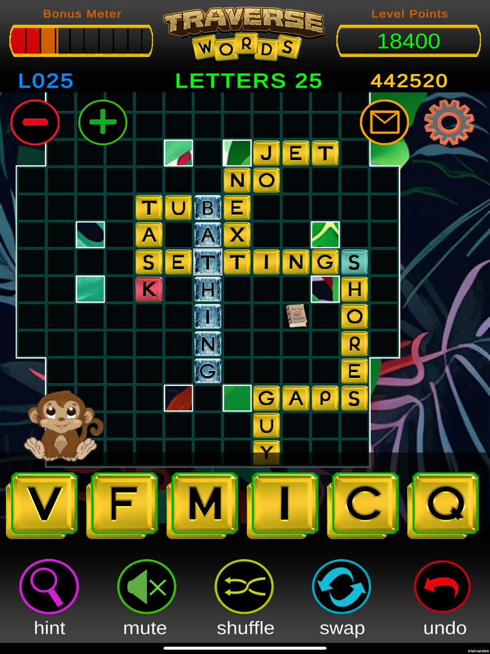 Using mystery letters (?) gain you double word points unless frozen. Collecting bonus items earn you extra points or refill the bonus meter if depleted. Some bonus items also initiate cute animations with our little mascot Monkey.