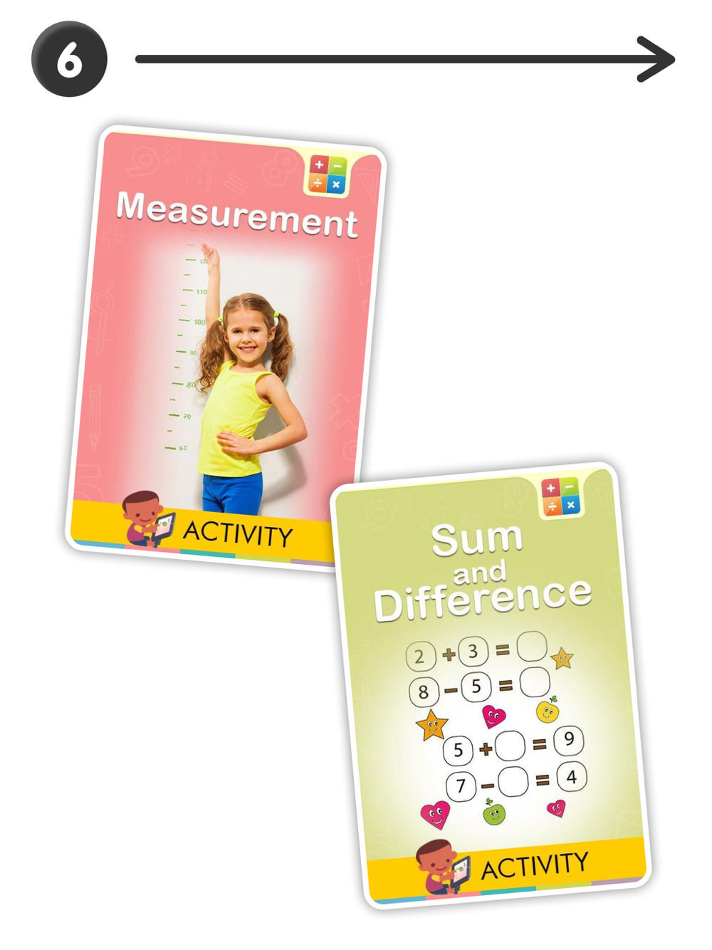 Math activities cover all the required skills for pre-K and Kindergarten such as counting, comparing, identifying and classifying shapes, size, positions, measurement, addition, subtraction, sum and difference, graphs, time, patterns, introduction to fractions, and probability.