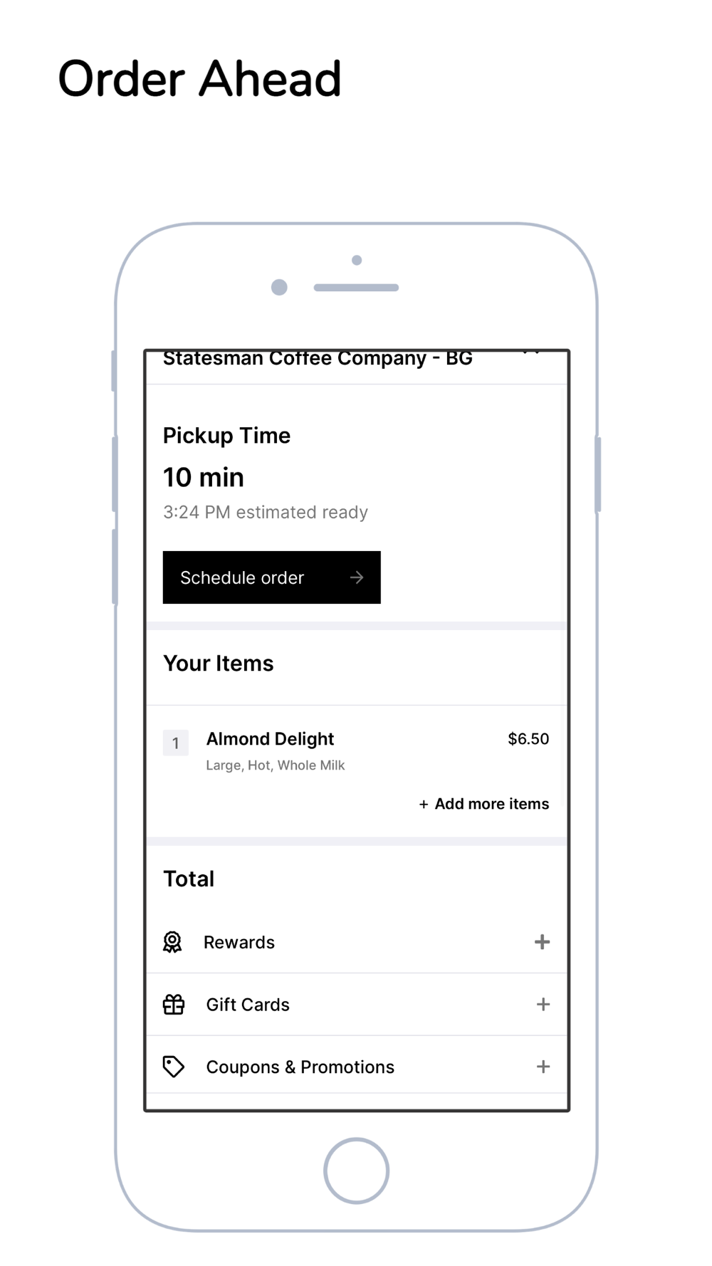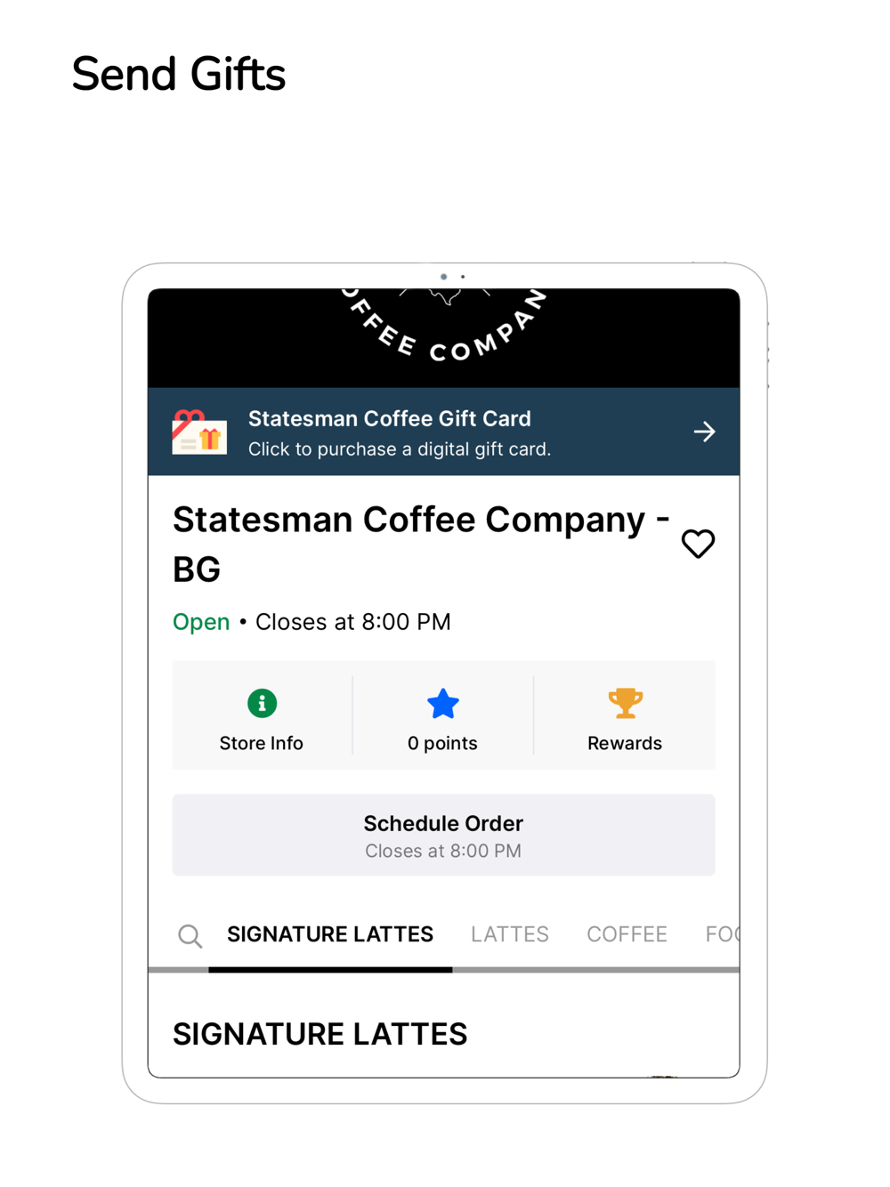Order ahead with Statesman Coffee Company. Earn rewards for every dollar spent! Save your payment for faster checkout.