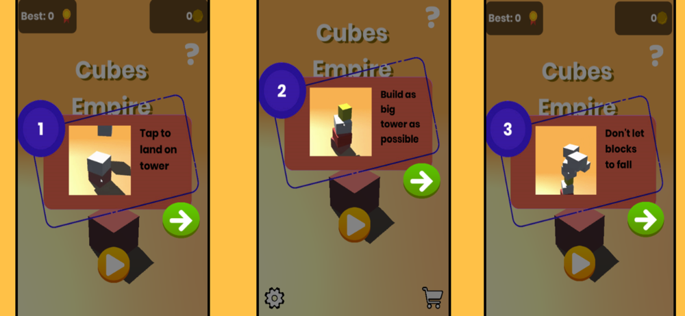 Land on tower to make it bigger. Each cube has its own feature, so be careful. And if your land won't be successful your tower will fall. Complete missions to get more points and even to get coins. The bigger tower you build the more points you will get? Set high records while building tower from different cubes. Collect coins to buy new maps in the shop. There are 5 available locations: default location, street, sci-fi, dungeon and chess board. But remember that your tower is very weak, so jump carefully. Random cubes will be moving toward to your tower. They can make your tower bigger or destroy it. Build the biggest cubes empire!