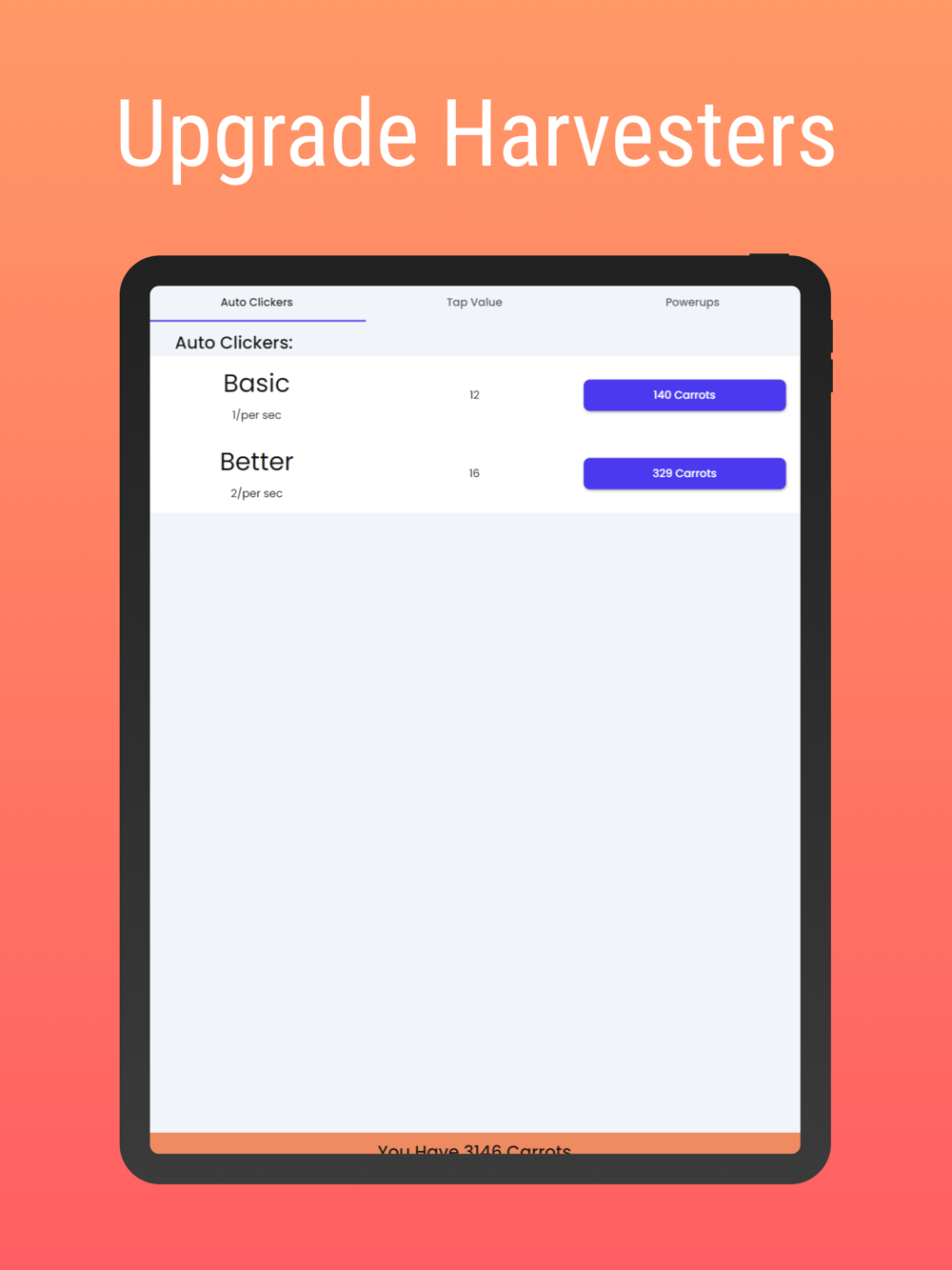 Do you want a fun and competitive clicker? Well, install Carrot Clicker! This game is free to play, is suitable for all ages and can bring endless fun to those who play. New updates coming soon possibly including multiplayer and power-ups that will raise your competitiveness and boost your carrots!