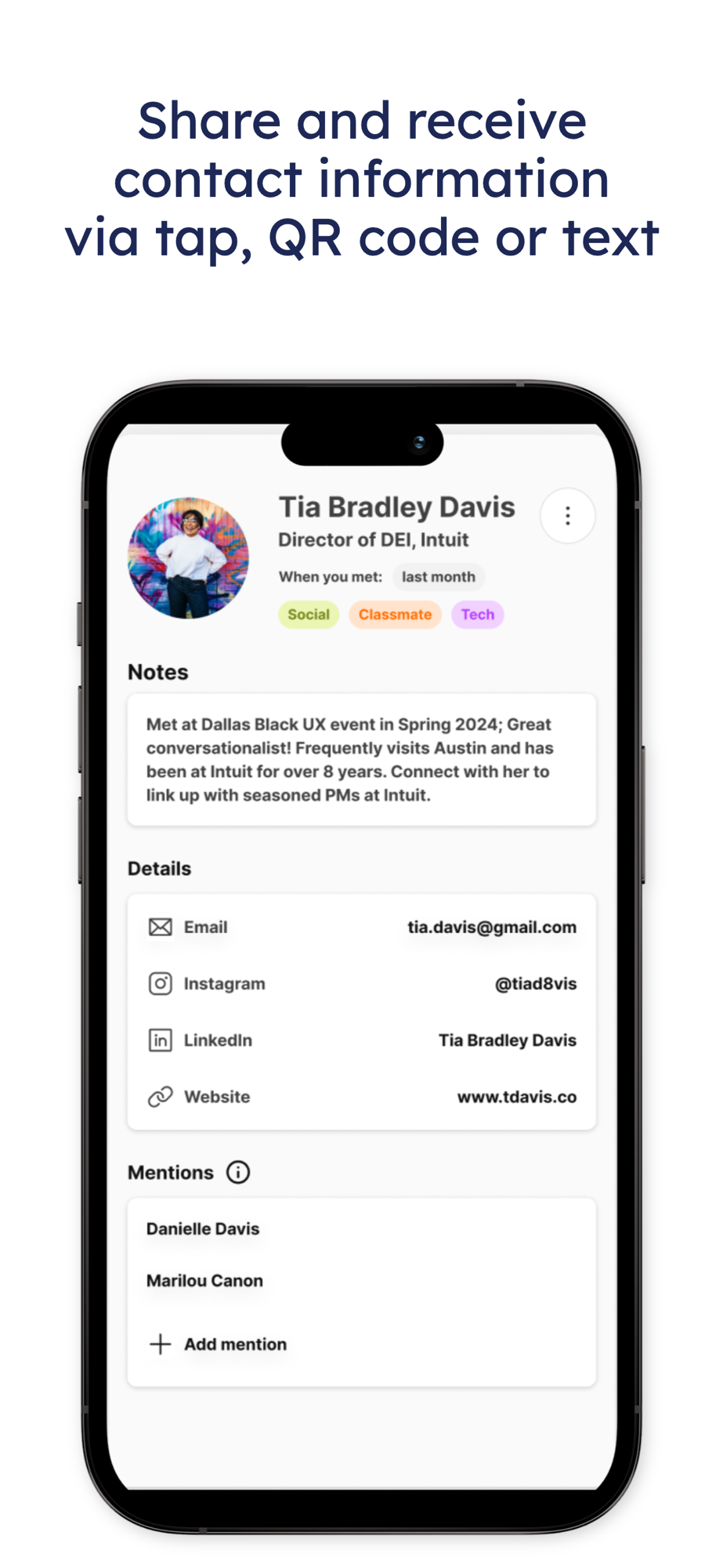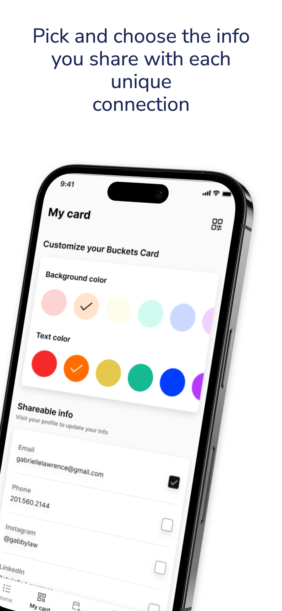 Control the data you share by picking and choosing just the social and contact information you feel comfortable sharing with a new friend. They can quickly "share back" the same or different info and you both can see when and where you've met, in case you forget their name after a long night of networking and meeting new people. Tag new friends with categorical and informative "Bucket tags" for later recall so you can quickly find the investor you need to follow up with, the classmate you wanted to share that podcast with or that potential new friend you wanted to grab drinks with. Automate reaching out with our Workflows feature which allows you to have AI summarize your notes on a connection and draft an email to them on a recurring cadence. Buckets ensures you don't just gather information, but you leverage it, to see your career, social or love opportunities to their fullest potential.