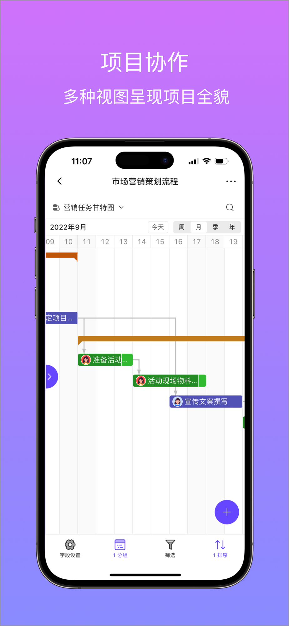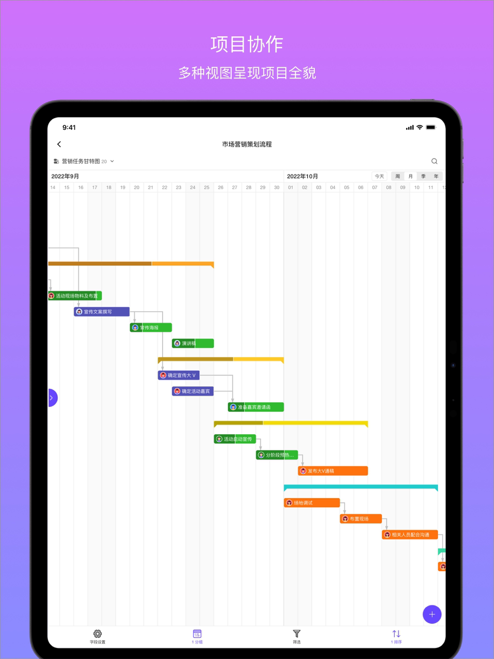 将业务规划和落地执行完美结合,支持即时编辑、任务前后置关联、创建里程碑、统筹时间安排、消息提醒等。