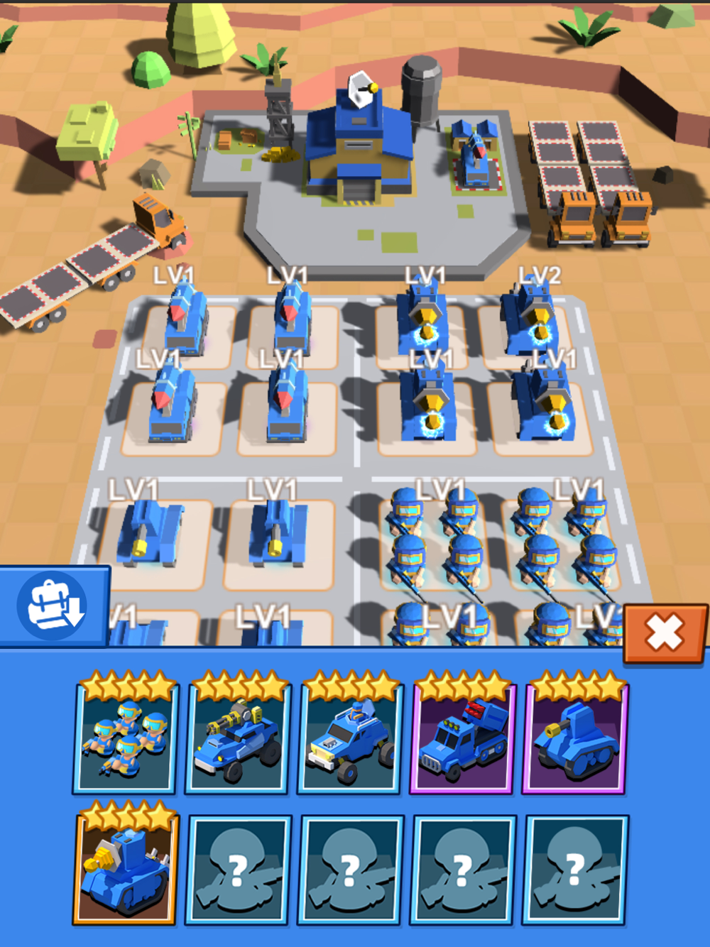 This is a strategic battle game. Players need to upgrade and form a stronger army by synthesizing small soldiers, tanks, Rocket artillery and other combat units, and finally destroy the enemy.